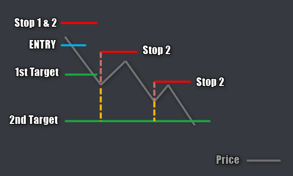 I don't think this can achieve what I'm asking. I do not want to input a specific Trigger Offset. Let's say my 1st target has been hit. I want my Stop 2 to trail an equal distance to my 2nd Target based on current price. If I adjust my 2nd Target then my Stop 2 will also adjust (but never more than my max -10 of risk). Please look at the attached picture for reference. You can see after my 1st Target is hit my Stop 2 has moved down an equal distance(dashed red line) to my 2nd Target(dashed yellow line) based on price. |