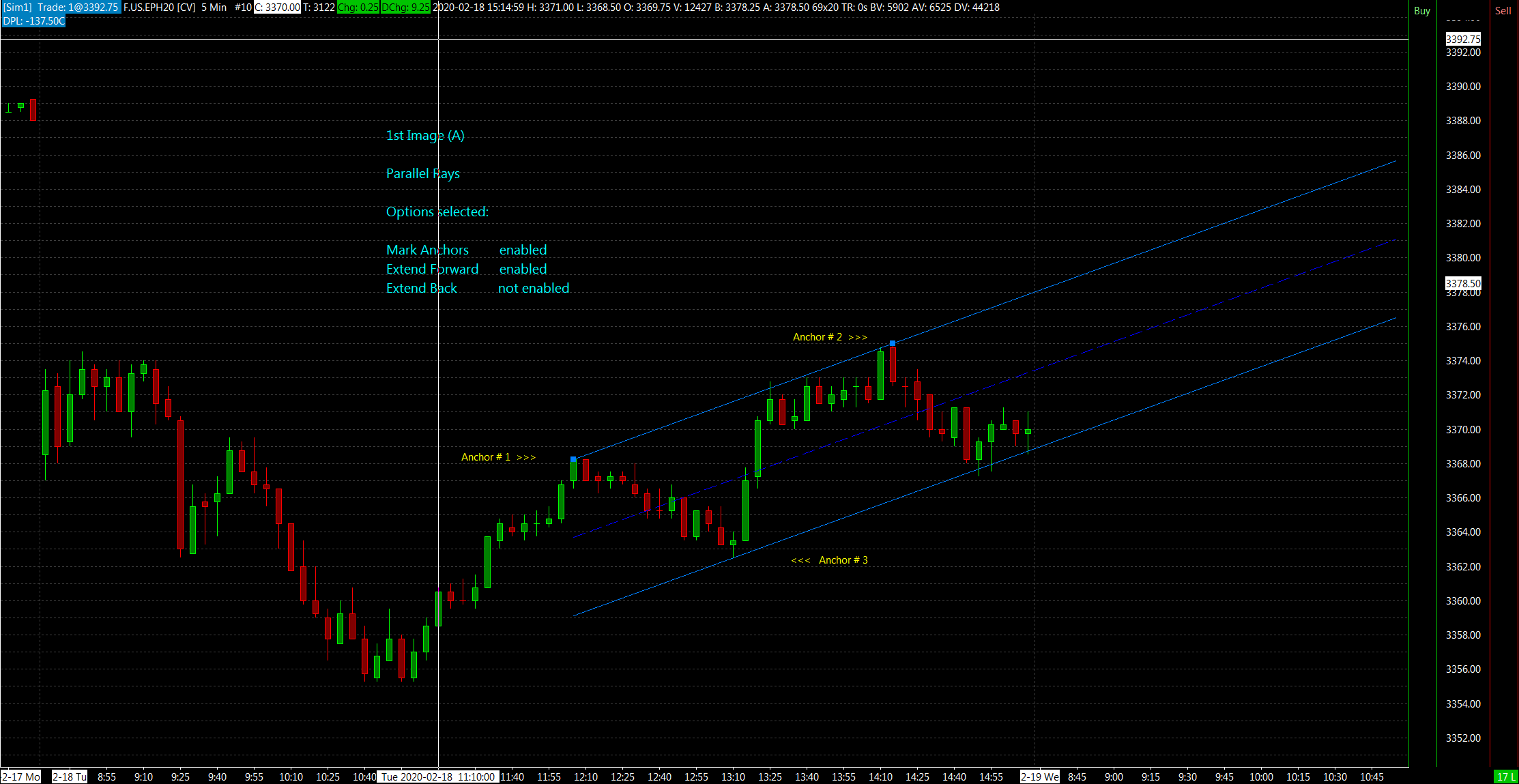 There seems to be an issue with the drawing tool Parallel Rays. The problem only occurs when certain options are enabled. I have included two chart images of the ES emini S&P 5 min chart (regular trading session only). (A) The first image captures the Parallel Rays with the following options selected. 1. Mark Anchors (enabled) 2. Extend Forward (enabled) The parallel ray extensions are displayed correctly. (B) The second image captures the Parallel Rays of the same chart and the same anchor points with the following options selected. 1. Mark Anchors (enabled) 2. Extend Forward (enabled) 3. Extend Back (enabled) Notice that when the "Extend Back" option is selected, the parallel rays are incorrectly shifted and do not match the original anchor points 2 & 3. >>> Please note that this issue seems to happen only when "Extend Forward" and "Extend Back" are both enabled at the same time. If "Extend Back" is enabled but "Extend Forward" is not enabled, then the rays are displayed correctly. http://www.sierrachart.com/image.php?Image=1582078489167.png http://www.sierrachart.com/image.php?Image=1582078535982.png |
