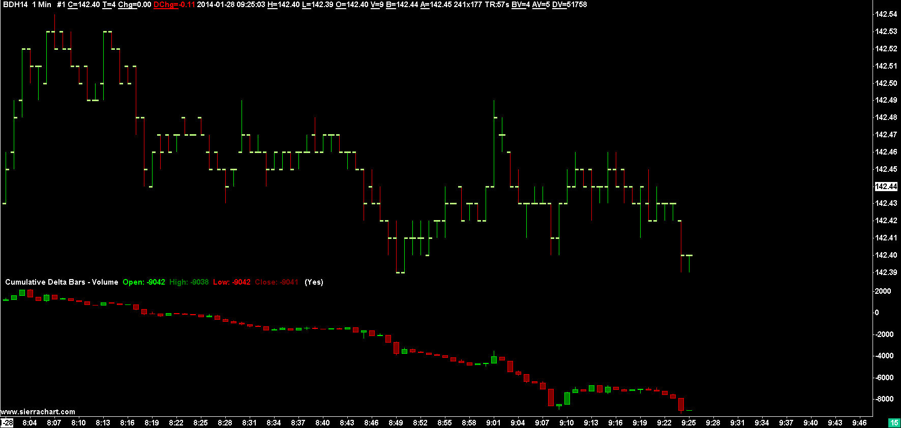 There have been some changes with a Sierra Chart EUREX data feed, but it is really very hard to make any conclusive determinations about this. We really have to get back to basics and make a clear determination as to what the objective here really is. And what the meaning of bid volume and ask volume is. Our understanding of a trade at the bid is when a market order hits the best bid price which is established by a limit order and there is a trade. A trade at the ask is when a market order hits the best ask price which is established by a limit order and there is a trade. Trying to determine this from a data feed, requires very good synchronization between the bid and ask data and the last trade price data. Unless the exchange, like the CME does, indicates this, determining this from the price feed is imperfect at best. This is a chart of IQ feed Cumulative Delta for today for the March DAX futures: http://www.sierrachart.com/image.php?l=1390817582313.png This is the Sierra Chart EUREX feed: http://www.sierrachart.com/image.php?l=1390817632919.png The DAX is up on the day from its opening price. Does it make sense that the Cumulative Delta from IQ feed is so negative? And although IQ Feed has developed a good reputation, the actual calculations of bid volume and ask volume do not come from the exchange, they do not come from IQ Feed, they come from Sierra Chart based upon last trade price data, and best bid and ask price data. There is an algorithm applied to this to make the determination. Whether Sierra Chart is doing this in the very best possible way with a difficult to work with feed like the EUREX, is not necessarily true as we spend more time looking at this. This is what makes this whole thing difficult . Based upon what we are seeing today, with these current charts, those who are putting faith on IQ Feed and the interpretation of the data by Sierra Chart, raises some questions for us. Maybe it is all just perfect. Although can we be sure? At this point, we really have to analyze the raw EUREX feed and get an understanding from the exchange exactly how that data feed works. So this will require more research time. Sierra Chart Support - Engineering Level Your definitive source for support. Other responses are from users. Try to keep your questions brief and to the point. Be aware of support policy: https://www.sierrachart.com/index.php?l=PostingInformation.php#GeneralInformation For the most reliable, advanced, and zero cost futures order routing, *change* to the Teton service: Sierra Chart Teton Futures Order Routing Date Time Of Last Edit: 2014-01-27 10:21:43