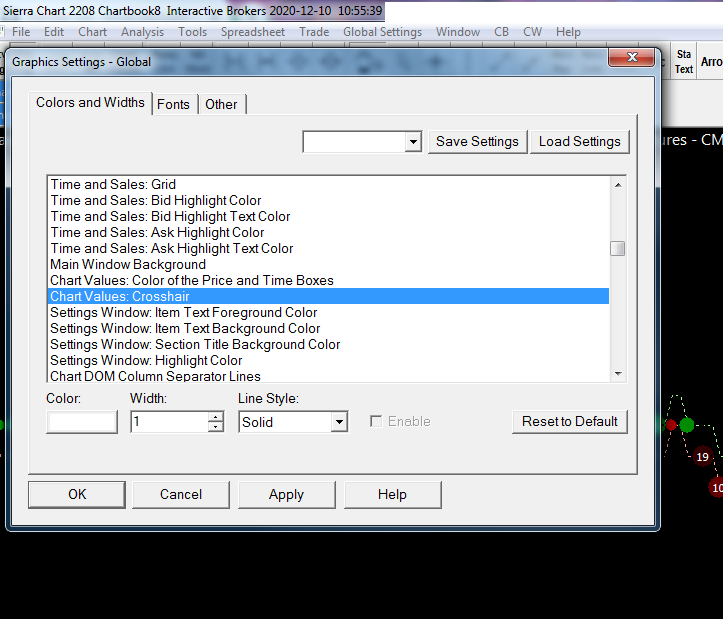 The post by Ackin gives the correct information. Here it is again: Graphics Settings: Chart Values: Crosshair For the most reliable, advanced, and zero cost futures order routing, use the Teton service: Sierra Chart Teton Futures Order Routing |