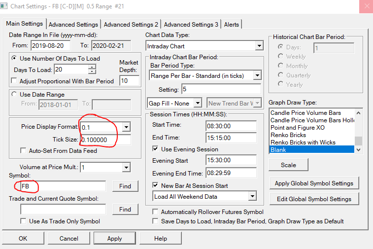 This is done through the Global Symbol Settings: Global Symbol Settings In the case of the symbol you show the Chart Settings screenshot for, you would want to change the settings on the ?? symbol pattern. Sierra Chart Support - Engineering Level Your definitive source for support. Other responses are from users. Try to keep your questions brief and to the point. Be aware of support policy: https://www.sierrachart.com/index.php?l=PostingInformation.php#GeneralInformation For the most reliable, advanced, and zero cost futures order routing, *change* to the Teton service: Sierra Chart Teton Futures Order Routing Date Time Of Last Edit: 2020-02-22 22:28:47