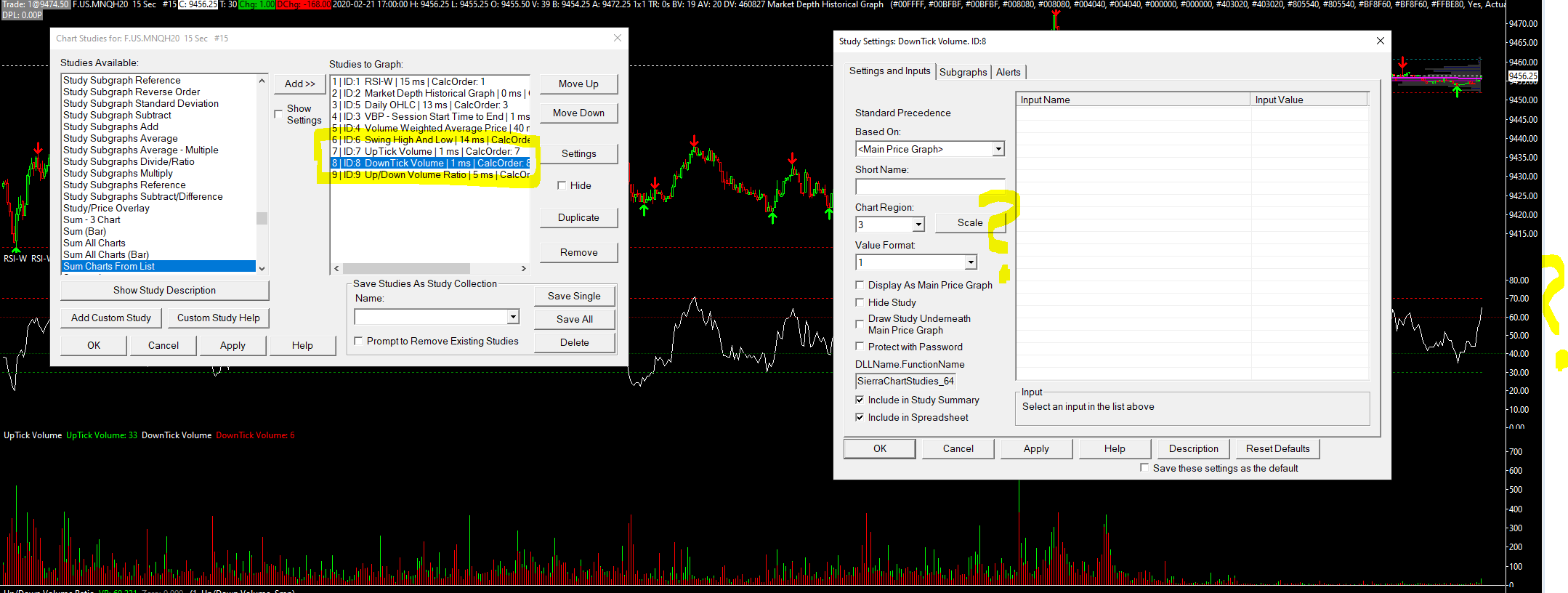 Hello, Thank you for your response. I have adjusted the study display order and this seems to toggle which study gets drawn first and overlaps in the same subgraph but does not combine the two into 1 single bar with downtick volume being plotted first in the bar then uptick volume being plotted above in the same bar. I wasn't sure what you mean by make the subgraph width wider. I highlight the two areas i thought might pertain to what you meant by the width with yellow highlighted question marks on the picture. I have tried increasing the width of the subgraph window if that is was suggested but that still would have the downtick study overlapping the uptick study. |