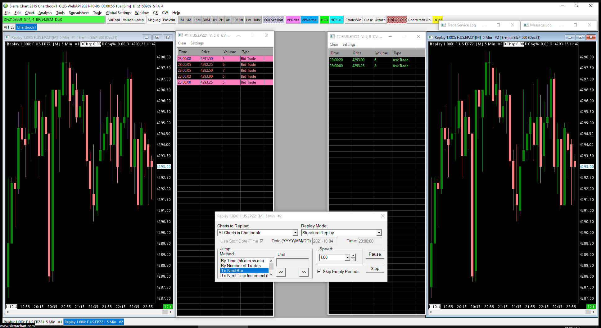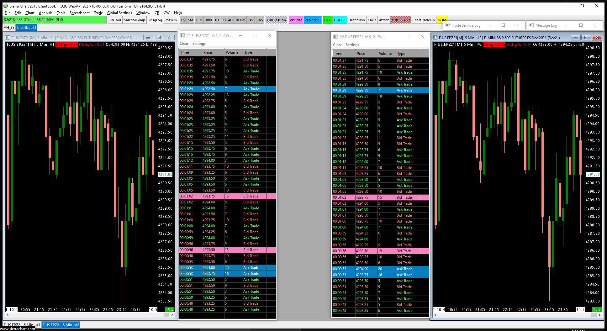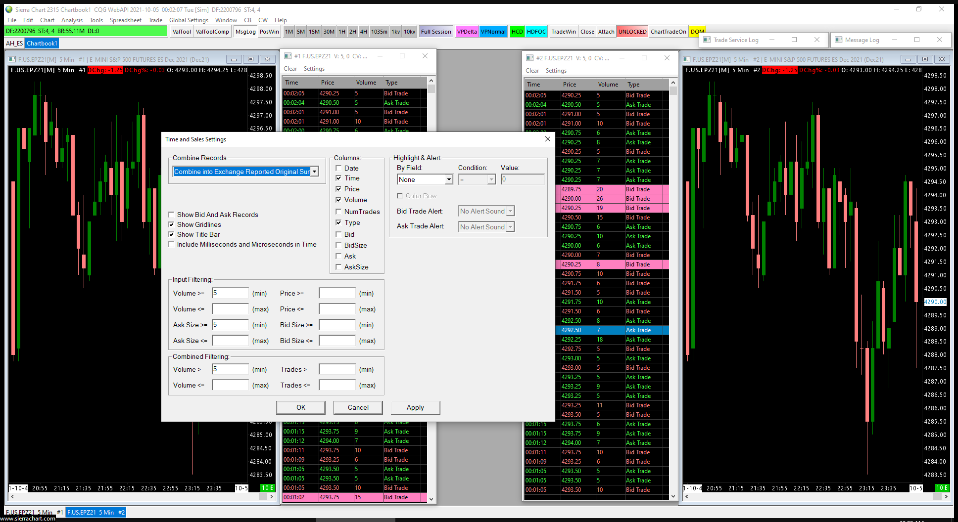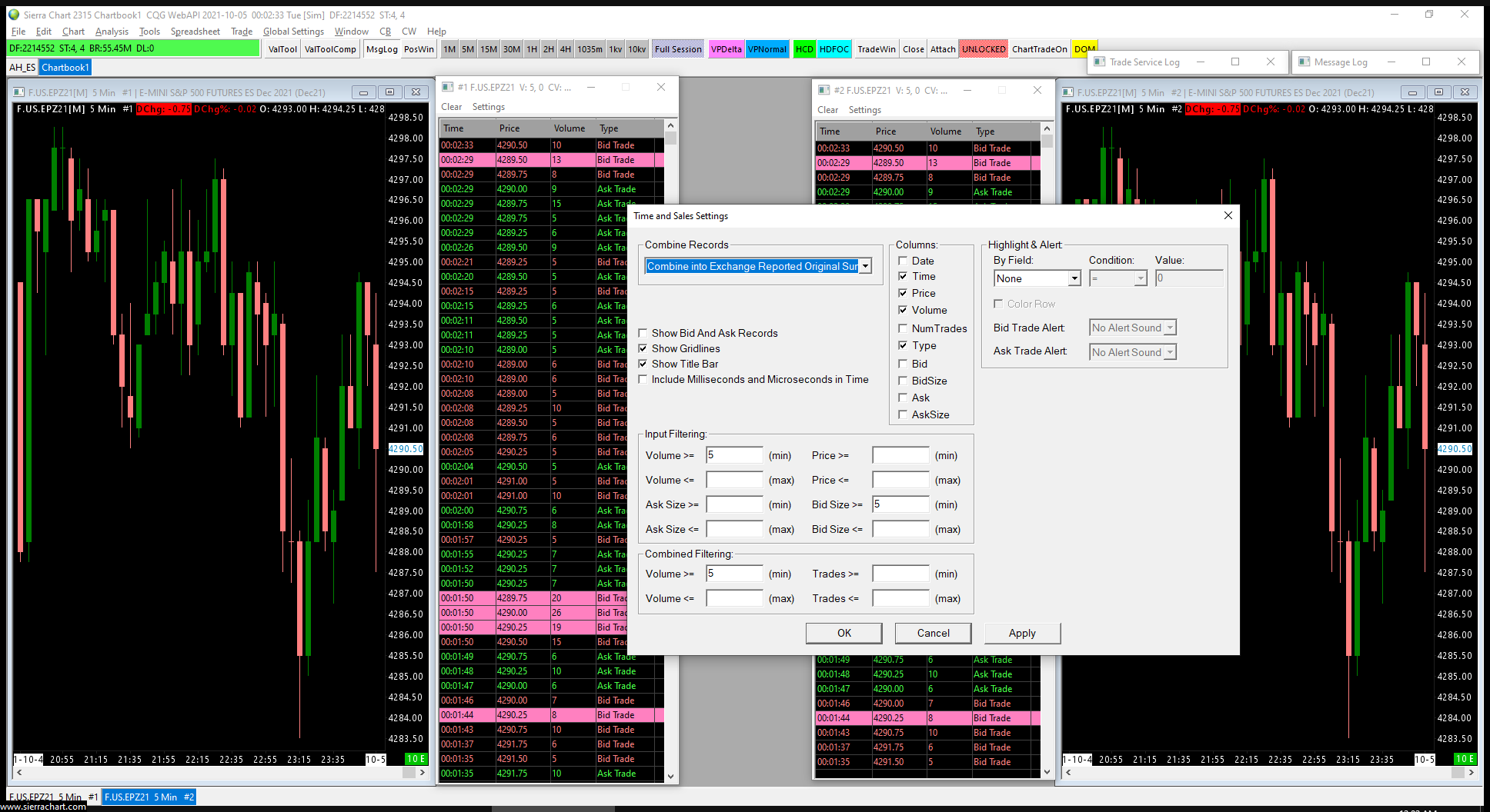 Hi tdd2672 and Sierra Chart support, Was there a solution for this? I am too trying to create separate Time and Sales windows, one for ASK volume only, another for BID volume. I was able to have it working the way I want in SIM mode only, but the filters don't work with LIVE data. Please see screenshots and the test chartbook attached. SIM Mode: http://www.sierrachart.com/image.php?Image=1633417257662.png Live Data: http://www.sierrachart.com/image.php?Image=1633417304587.png T&S Settings: http://www.sierrachart.com/image.php?Image=1633417328563.png http://www.sierrachart.com/image.php?Image=1633417355485.png |