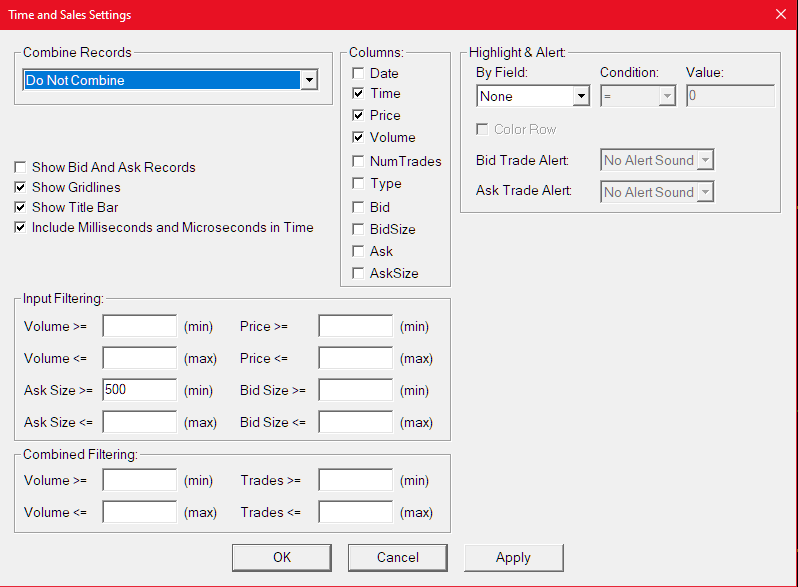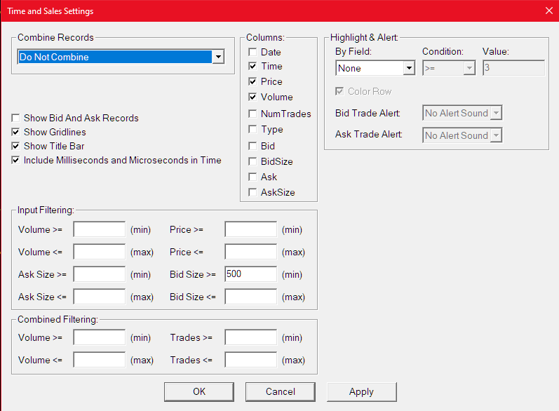 Time & Sales Filtering Ask/Bid Size Less than 1