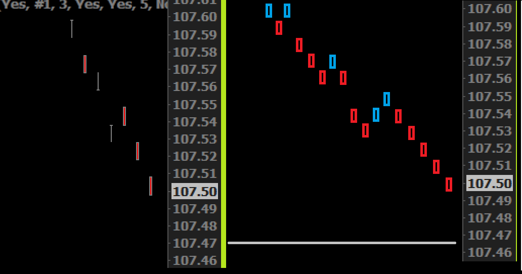 I have used Sierra Chart for some time but have suddenly realised that I didn't understand how the bars are formed ! Then I examined it in detail and saw that the bars represent transitions between prices and the colours have to be translated to know at what price a trade occurs. Here is a picture of a 1 range (standard) chart. On the left are standard bars. On the right is what the same data would look like if the chart showed trades and not transitions. It would be much easier, for myself at least, if you'd allow the user to display the charts as actual trades. Thanks. edit; no wonder most traders become obsessed with the minutest detail... when even a 1-range chart is actually a 2-range chart !! Date Time Of Last Edit: 2014-01-07 19:45:40