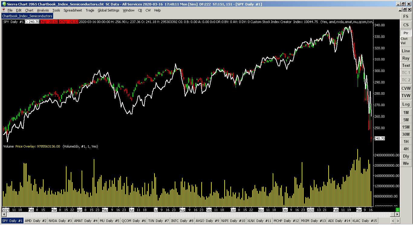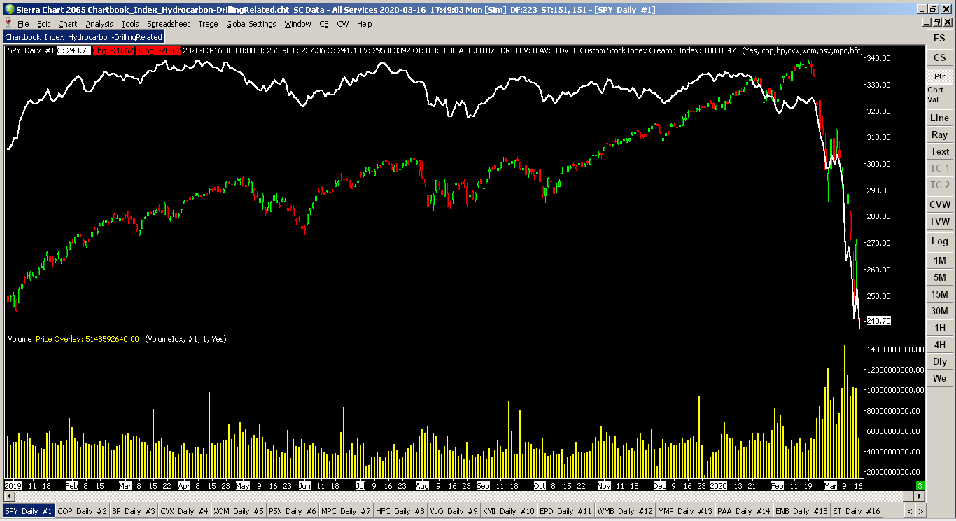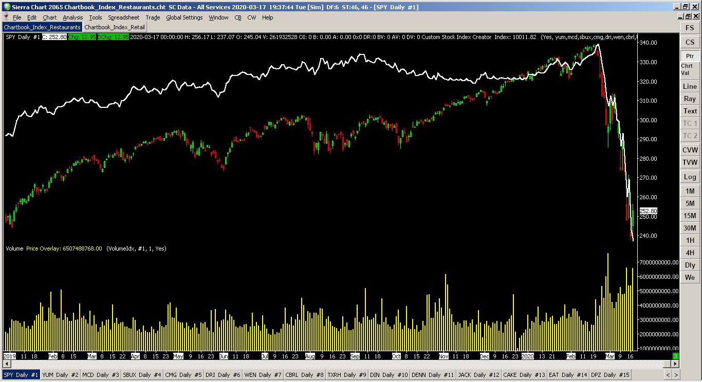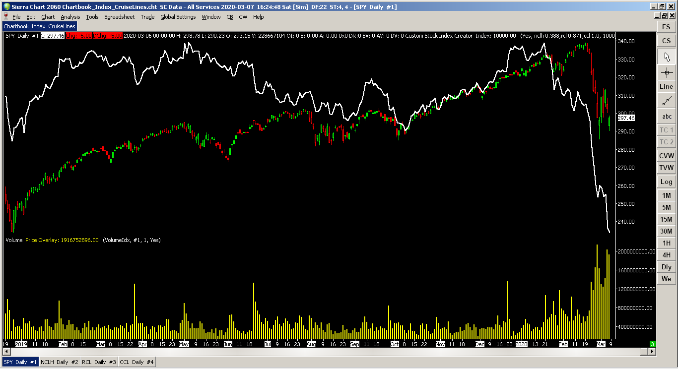 Watching the market whiplash the past couple weeks from coronavirus hysteria, I've been wondering 1) when will this be over, and 2) when's the best time to buy in? Keeping track of groups of stocks is exactly why I wrote my Custom Stock Index Creator (CSIC). It's free to download and use. Custom Stock Index Creator: Offering To The Community: Custom Stock Index Creator Main DLL (has CSIC plus my other tools, chose this or the one above): Offering To The Community: Brett Johnson's Standard Tool Kit Quick Compile Instructions: Offering To The Community: Brett Johnson's Standard Tool Kit | Post: 114621 Be sure to read the instructions at the top of the main CSIC page. This is one of my more complicated chart studies. To get the most out of it takes a little learning and understanding I outline in the documentation. If you've got money on the line, you'll want to do this anyways. Since I'm in the US, my references will be north+west hemisphere based. Outside of this area, the stocks will be different but all the concepts will be the same. For local traders in foreign markets (relative to my location), the same concepts also apply. (I have several sectors at the bottom of the page, but...) Let's get started with a simple example. You have read the CSIC documentation page by now, right? I usually like to open SPY in a new chartbook with daily bars going 5-10 years back as my base chart. Cruise Lines. These have gotten pounded the last few weeks. Since there are only 3 main ones, this will make an easy example template. I usually prefer several stocks for a better average for an index, but like I said, there are only 3. We have Carnival (CCL), Royal Caribbean (RCL), and Norwegian (NCLH). We have a couple ways to proceed: with and without weighting. Without weighting averages all equally and is quick to set up (esp for testing). This makes more of a "psychological interest" based index as a buy in one stock is equally weighted in a buy against another stock in the list. The three main weighting ideas can be mixed. First is how well all the stocks "should" track with each other (mentioned in the main documentation). Second is lowering the weight of a stock where management is doing "bad things" and is inappropriately skewing the index. This could also be raised if they're taking the market. Third is weighting the stock by some calculated metric such as Market Cap. If you've read the documentation, you'll know that any stock without a weight defaults to 1.0. Note: Since most of us are traders (with some secondary long term holdings), we tend to be vary paranoid about any and all squiggles on the chart. The more paranoid will want to use weightings based on the numbers that you are most familiar with based on your own personalized trading style. Since we all trade differently, there is no one single answer to make everyone happy... ...so here's an example you can modify to your own trading style: weighting by Market Cap. I jumped over to the finance.yahoo pages to get these numbers... but which to use? There's Market Cap for last quarter and there's also a daily calculated Market Cap. The Market Cap table could also be averaged. Since I'm guessing that these three cruise lines are big enough to not go under (pun?), I'm going to choose last reporting quarter. This represents how they were and how they're likely to proportionally be to each other after the coronavirus subsides. As I mentioned above, the #2 option in weighting has the idea of reducing the weight value if something bad happens like bankruptcy... or maybe bump the weight up a little higher if one company positions itself far better than another. On the Yahoo pages are also enterprise value, P/E ratios, revenue, and profits that could be swapped out for Market Cap in this example if your trading models use them. I'll stick with last quarter Market Cap since it's a common weighting and easy to understand. CCL=$32.12b (2019-11-30, older but still usable) RCL=$27.99b (2019-12-31) NCLH=$12.45b (2019-12-31) Take the largest Market Cap from CCL and we'll set that equal to a weighting of 1.0 (100%). The others will be a fractional percent of CCL in terms of size. RCL is next, so divide it by CCL: $27.99b/$32.12b = 0.871 NCLH is the last to divide by CCL: $12.45b/$32.12b = 0.388 Note: Order in the Symbol List doesn't matter, but to keep things simple and understandable, stick with the largest Market Cap for the denominator (CCL in this case). Weightings greater than 1.0 are fine if Market Cap changes in the future. There is no artificial limitation. Note 2: If your stock weighting divides out to less than 0.1 (10% or less the size of the largest by Market Cap), it may not worth being included in the Symbol List since it would be so small. If you still want it and there are other small ones like it, maybe don't use weightings. ...So, the Market Cap weighted Symbol List line to plug into the CSIC study would be: CCL 1.0, RCL 0.871, NCLH 0.388 ...And if you want just a quick look without weightings: CCL, RCL, NCLH Note: When changing stocks in the CSIC, set "Close All Other Charts?" to "One Shot" to clean up the chartbook. Everything will reload. Hit OK in the Study Settings window and Sierra Chart will flash windows about as it loads the data in the background. This can take a minute. See the main documentation for the gotchas. You did read that, right? You can also add volume, which I find to be handy, in a second chart region. (See attached image file) Once done, you'll see bars from SPY and a white line overlaid on top of it for the cruise line index. From the beginning of 2019 to Friday's last trade (March 6), you'll see a semi-smashed head and shoulders pattern. For Friday, there was a slight turn up to the free fall. In Elliott Wave Theory (EWT), this is somewhat expected as it is almost half the length of the first free fall. EWT states there could be another half length fall before bottom. Stepping back from technical analysis, given that 
