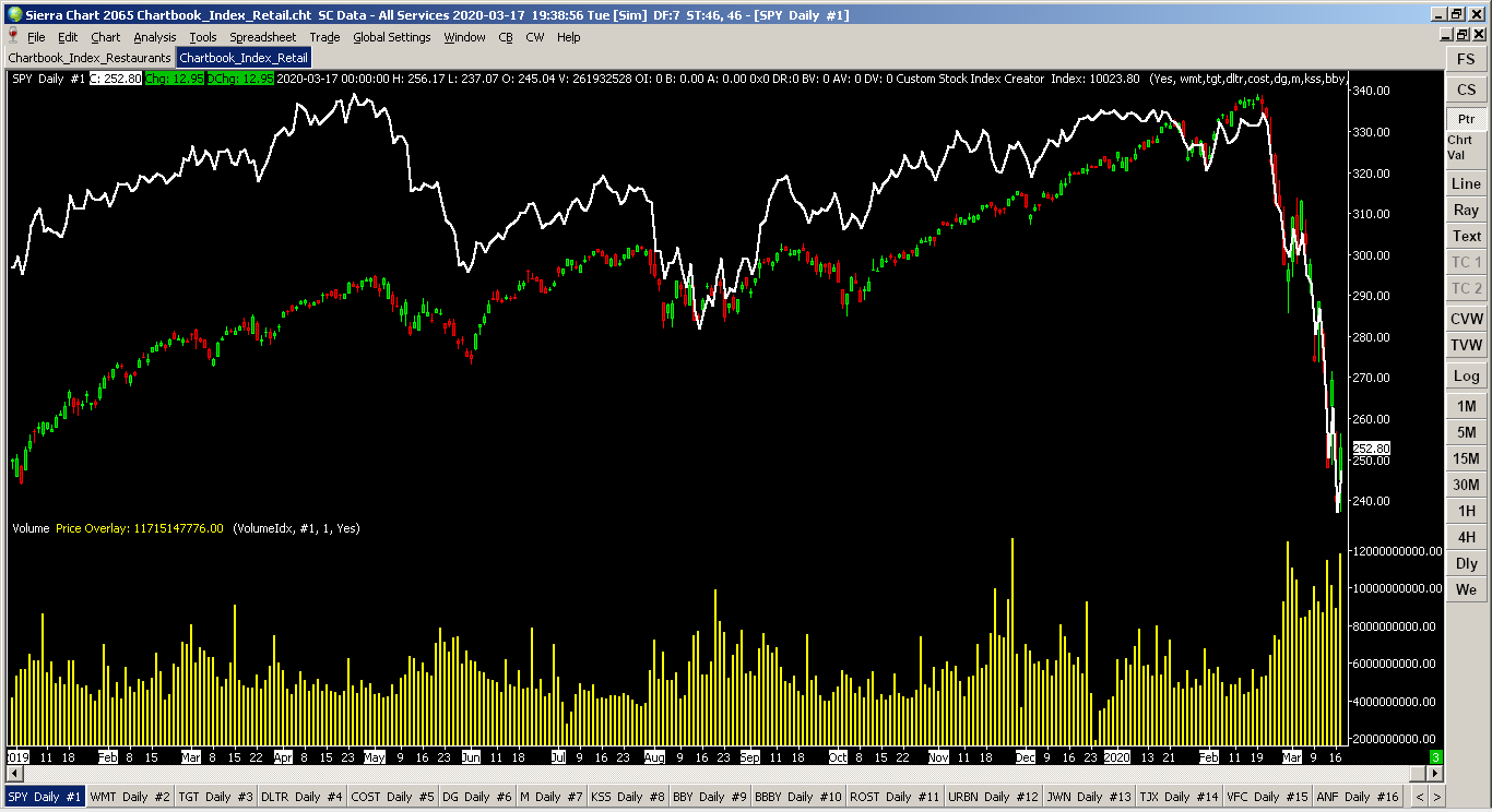 Adding... (pics of Restaurants and Retail attached) Home Builders: NVR (NVR), TOL (Toll Brothers), PHM (Pultegroup), LEN (Lennar), DHI (DR Horton), KBH (KB Homes), MTH (Meritage), MDC Symbol List: NVR, TOL, PHM, LEN, DHI, KBH, MTH, MDC Thoughts: People can't pay for homes if they can't work and are bunkered down. Retail: WMT (Wal-Mart), TGT (Target), DLTR (Dollar Tree), COST (Costco), DG (Dollar General), M (Macy's), KSS (Kohls), BBY (Best Buy), BBBY (Bed Bath & Beyond), ROST (Ross), URBN (Urban Outfitters), JWN (Nordstrom), TJX, VFC, ANF (Abercrombie & Fitch), RL (Ralph Lauren), AEO (American Eagle Outfitters), GPS (The Gap), TIF (Tiffany), LB (L Brands), GES (Guess), FL (Foot Locker), HBI (Hanesbrands), TPR (Tapestry), CPRI (Capri), UA (Under Armour), LULU Symbol List: WMT, TGT, DLTR, COST, DG, M, KSS, BBY, BBBY, ROST, URBN, JWN, TJX, VFC, ANF, RL, AEO, GPS, TIF, LB, GES, FL, HBI, TPR, CPRI, UA, LULU Thoughts: Some are stronger than others. Some are in more critical areas than others. Retail will be volatile. Big Auto: F (Ford), TM (Toyota Motor), GM (General Motors), HMC (Honda), TSLA (Tesla), FCAU (Fiat), NSANY (Nissan) Symbol List: F, TM, GM, HMC, TSLA, FCAU, NSANY Thoughts: The index line the past year has been mostly range limited. When the crash ends, there should be a good reversal indicator at the bottom. Restaurants: YUM, MCD (McDonalds), SBUX (Starbucks), CMG (Chipotle), DRI (Darden), WEN (Wendy's), CBRL (Cracker Barrel), TXRH (Texas Roadhouse), DIN (Dine), DENN (Denny's), JACK (Jack in the Box), CAKE (Cheesecake Factory), EAT (Brinker), DPZ (Domino's Pizza), PZZA (Papa John's), DNKN (Dunkin' Brands), QSR (Restaurant Brands), SHAK (Shake Shack) Symbol List: YUM, MCD, SBUX, CMG, DRI, WEN, CBRL, TXRH, DIN, DENN, JACK, CAKE, EAT, DPZ, PZZA, DNKN, QSR, SHAK Thoughts: These will be hit the hardest with isolation orders. Food venues with drive-thru will do better than sit-down only. Once the orders are lifted, these will bounce back. Casino: MGM, WYNN, WYNMY (Wynn Macau), MLCO (Melco), LVS (Las Vegas Sands), IGT (International Game Tech), BYD (Boyd Gaming), SCHYY (Sands China), CZR (Caesars Entertainment), PENN (Penn National Gaming), ERI (Eldorado Resorts), SGMS (Scientific Games), MCRI (Monarch Casino), RRR (Red Rock), GDEN (Golden Entertainment), CHDN (Churchill Downs), MLCO (Melco Resorts), MGP (MGM Growth Properties), GLPI (Gaming and Leisure Properties) Symbol List: MGM, WYNN, WYNMY, MLCO, LVS, IGT, BYD, SCHYY, CZR, PENN, ERI, SGMS, MCRI, RRR, GDEN, CHDN, MLCO, MGP, GLPI Thoughts: These will behave similar to restaurants. Once fear drops, people will start traveling again. |