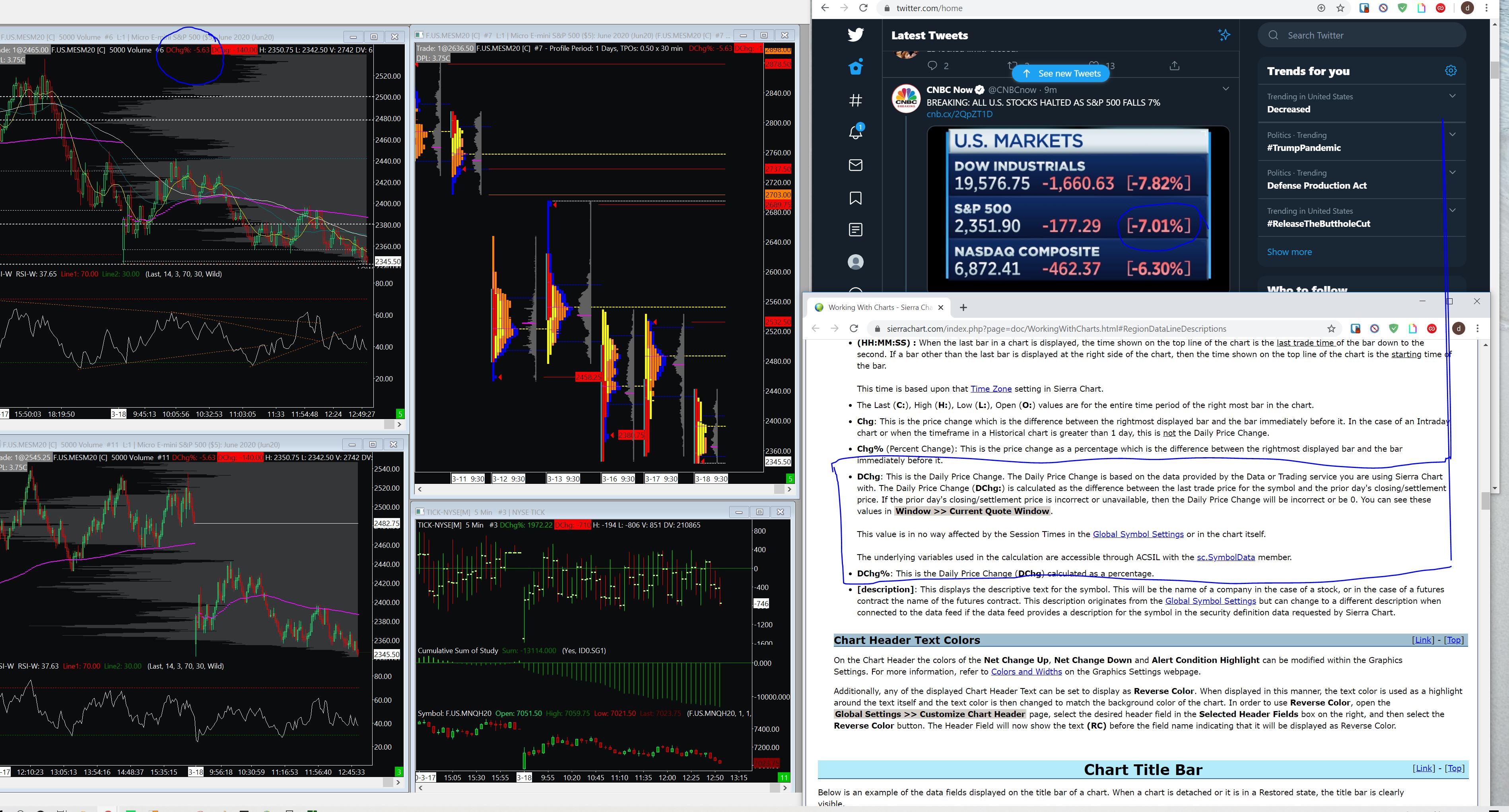 Hello, I am having an issue with the daily change % not matching up on my chart header. I have attached a picture with chart header circled as well as a reference on my twitter feed showing the market being down 7%. I do need this to reflect accurately for market halt levels. I was not able to find any options to adjust time settings etc for daily change%. Thank you, Daniel |