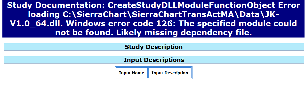 Windows error code 126 in no way relates to authorization to use those studies. And if someone developed them specifically for you, there would be no separate authorization required. This is a technical error which most likely is related to some other missing DLL file the DLL is dependent on. Also, we see no shared files on your account. Sierra Chart Support - Engineering Level Your definitive source for support. Other responses are from users. Try to keep your questions brief and to the point. Be aware of support policy: https://www.sierrachart.com/index.php?l=PostingInformation.php#GeneralInformation For the most reliable, advanced, and zero cost futures order routing, *change* to the Teton service: Sierra Chart Teton Futures Order Routing Date Time Of Last Edit: 2020-03-23 01:44:04