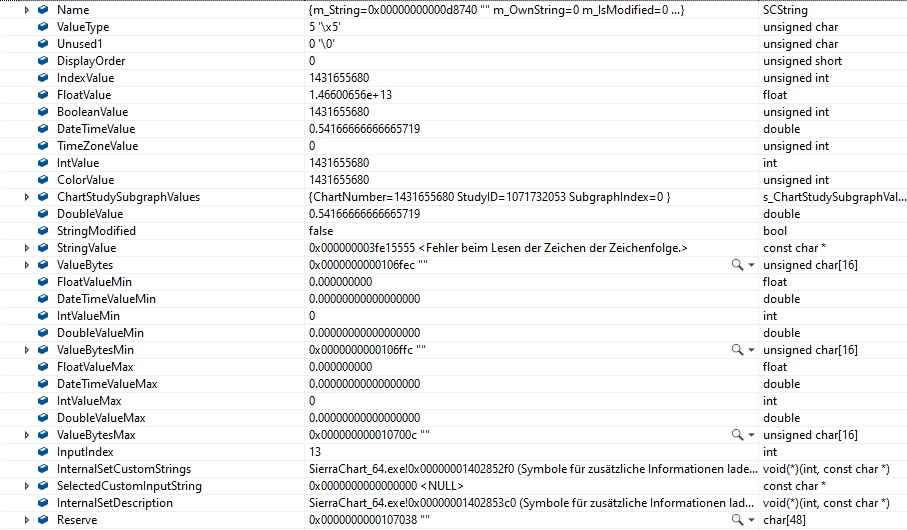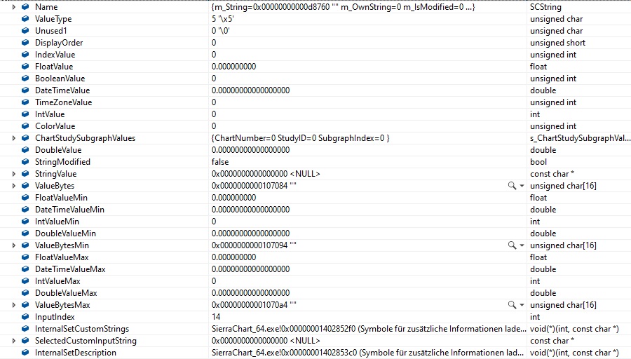 Dear ladies and gentlemen, I have an issue with sc.Input[] and sc.Subgraph[] - as the issue is the same with both, I'll only describe the issue for sc.Input[] in detail. I created a study with 18 sc.input[] fields, following your guidelines (three points "..." in the source code mean, I removed lines for a better readability): SCSFExport scsf_Test(SCStudyInterfaceRef sc) { ... SCInputRef input12 = sc.Input[12]; SCInputRef input13 = sc.Input[13]; SCInputRef input14 = sc.Input[14]; ... if (sc.SetDefaults) { ... input12.Name = "Input 12"; input12.SetYesNo(0); input13.Name = "Input 13"; input13.SetYesNo(1); input14.Name = "Input 14"; input14.SetYesNo(1); ... return; } ... } I made sure input0 to input17 are defined and there is no missing index on sc.Input[index]. My issue is as follows: all inputs besides index 13 are initialized perfectly fine, input 13 contains weird information. I'm aware this sounds impossible but when I debug the code and start debugging at the line where the definiton of defaults starts (Line: if (sc.SetDefaults)) - so no processing of the study has been done yet, only the definition of fields - I receive the information in the debug window documented in the attached files Input12.jpg to Input14.jpg. Based on this information, input 12 and 14 (like all others) seem to be initialized correctly where input 13 was not. Regardless what is being captured in input13, it does not return the information captured in the configuration window. I do have exactly the same issue with sc.Subgraph[0] with 13 sc.Subgraphs definded - all others work perfectly fine - sc.Subgraph[0] does not return the information captured in the configuration window. Can you please take a look into this? If you need additional debug information or anything else please don't hesitate coming back to me! Thanks a lot in advance! |