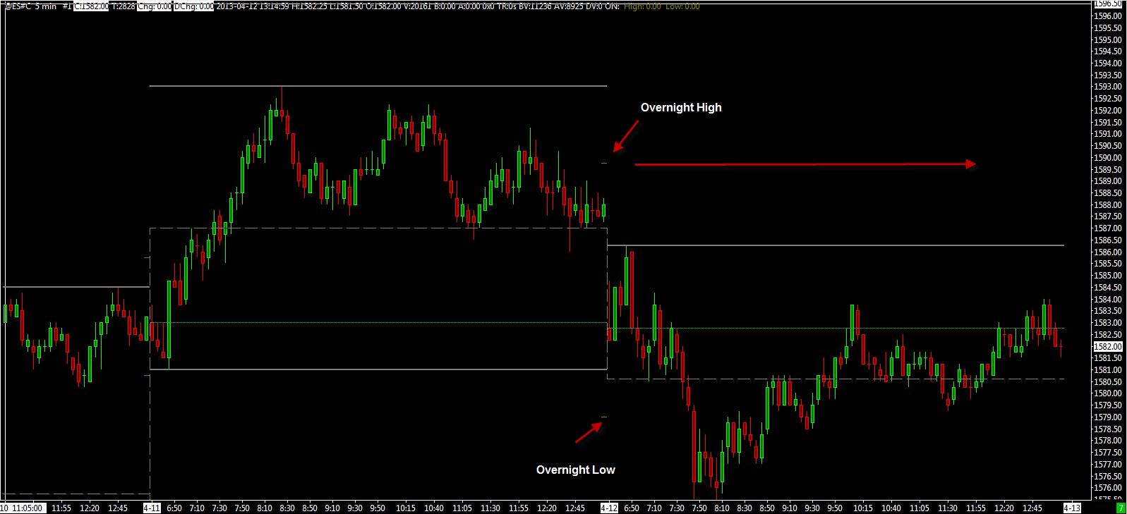 Have a look at the High/Low For Time Period studies: http://www.sierrachart.com/index.php?l=doc/doc_TechnicalStudiesReference.html#s313 You will need to use this on a chart that has the the overnight session and overlay it on your regular session chart. Also check the inputs for the Study/Price Overlay study. You probably will want to use Fill Blanks with Last Value. Sierra Chart Support - Engineering Level Your definitive source for support. Other responses are from users. Try to keep your questions brief and to the point. Be aware of support policy: https://www.sierrachart.com/index.php?l=PostingInformation.php#GeneralInformation For the most reliable, advanced, and zero cost futures order routing, *change* to the Teton service: Sierra Chart Teton Futures Order Routing Date Time Of Last Edit: 2013-04-15 04:36:01