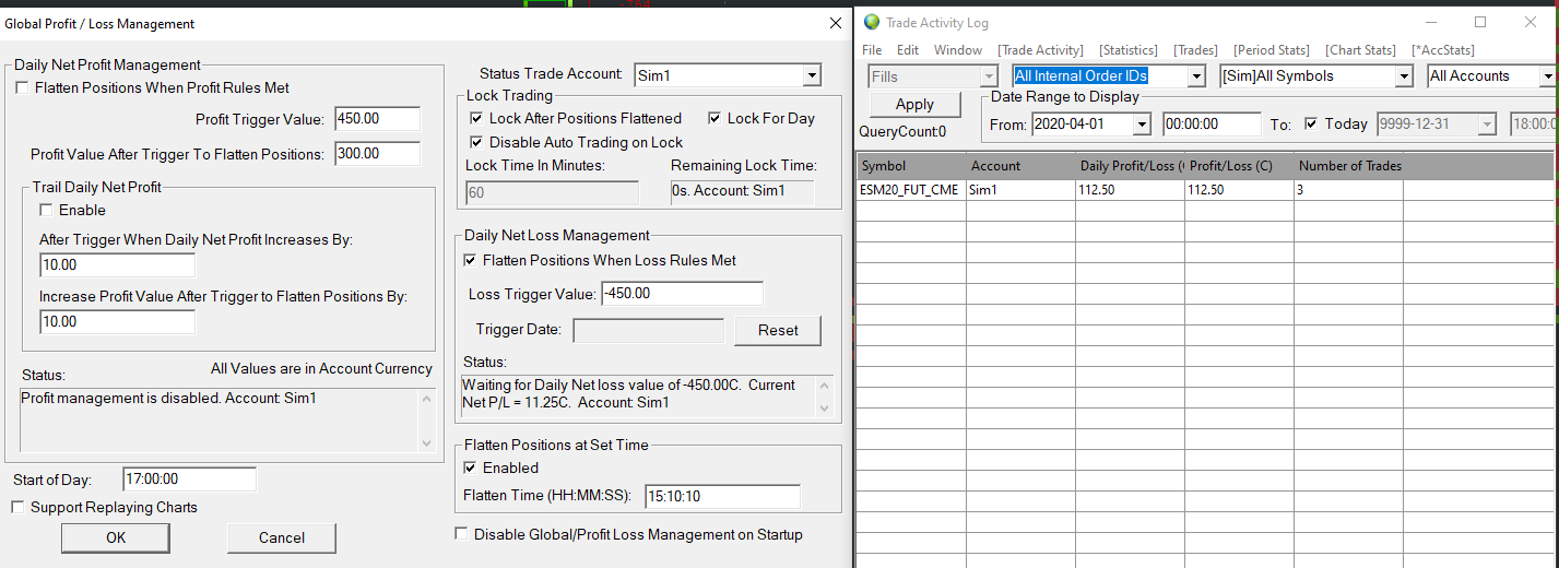 You are making a completely wrong comparison here: https://www.sierrachart.com/Download.php?Folder=SupportBoard&download=37408 The Global Profit/Loss Management does not use the data from the Account Stats tab at all. That is completely irrelevant and has no connection at all. You need to look at the Trade Stats for Charts tab as we requested. Sierra Chart Support - Engineering Level Your definitive source for support. Other responses are from users. Try to keep your questions brief and to the point. Be aware of support policy: https://www.sierrachart.com/index.php?l=PostingInformation.php#GeneralInformation For the most reliable, advanced, and zero cost futures order routing, *change* to the Teton service: Sierra Chart Teton Futures Order Routing Date Time Of Last Edit: 2020-04-04 11:32:29