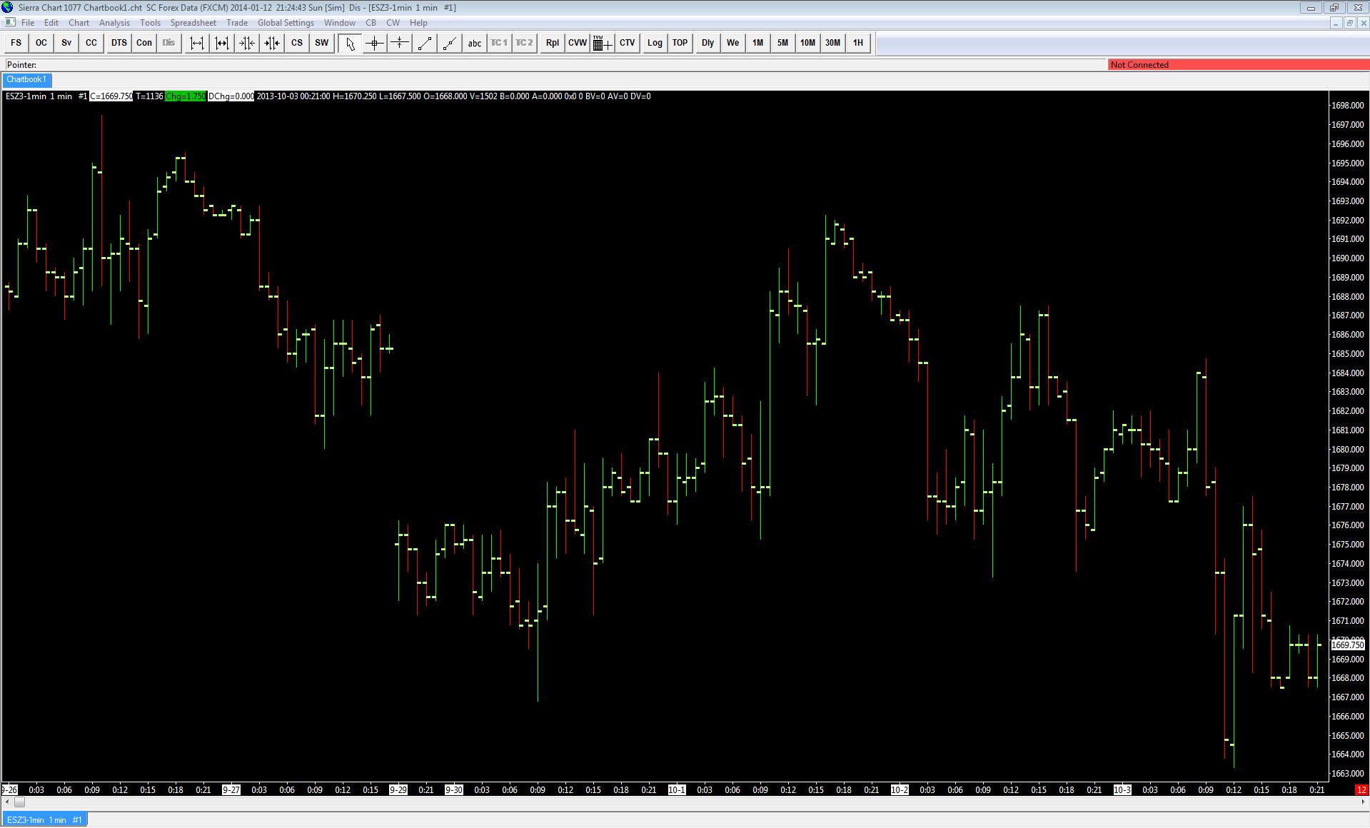 Today I tried to import my own data to Sierra Chart for trading simulation with following procedure and result: 1. FILE / Disconnect 2. Trying to import my own 1 min ES mini data in csv format from Nov 1997 to 25th Oct 2013 via EDIT / Import and Load Intraday Data 3. – sample of data format attached 4. Result – loaded only part of the data from only 26-09-2013 till 25-10-2013 (this is OK, my data end by this date) and not in 1 min format (see images of chart and copy of the log attached) Many thx for your help Ivan |