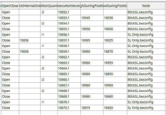 Summary: an old and non-existent twconfig file randomly gets used when I use a hot key to enter a trade. The settings file previously existed, it does not anymore. There must be a simple explanation. Details: Experimenting with SIM. Using new hotkeys for buy/sell. I recently set the hot keys after resetting previous settings. That is the only recent change. I have a main and second instance running. I have selected a new trade config and actively using it. Then suddenly, an old twconfig file gets employed for a few trades. I have not touched the config window all day. The old config name is NOT displayed in the trade window pulldown menu. But it is listed in the Trade Activity Log against the trades. The old config is buying 2 lots rather than 1 and has a different stop loss. It is totally different. The old config remains active for a few trades, then new trades revert back to using the one which is displayed in the trade window. The old twconfig file doesn't exist on my harddrive. It is an old one. Maybe I changed the settings some time ago and resaved it with another name, I do not know recall. I have checked the data folders for both instances. I have checked all my hotkeys for trade window configurations in both instances. None are set. I have attached the twconfig file I have been using. |