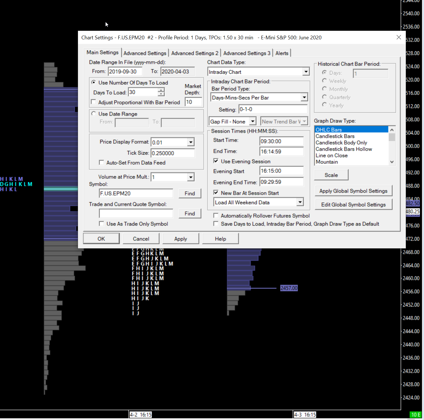 I have a TPO chart study. I am trying to set it so I can switch between just pit session from 9:30 to 16:14:59 and a 24 hours view. I spent a bunch of time trying to figure this out and found a way. Can you please let me know if I set this up properly? In Chart Settings, I have this setting: Start Time: 9:30:00