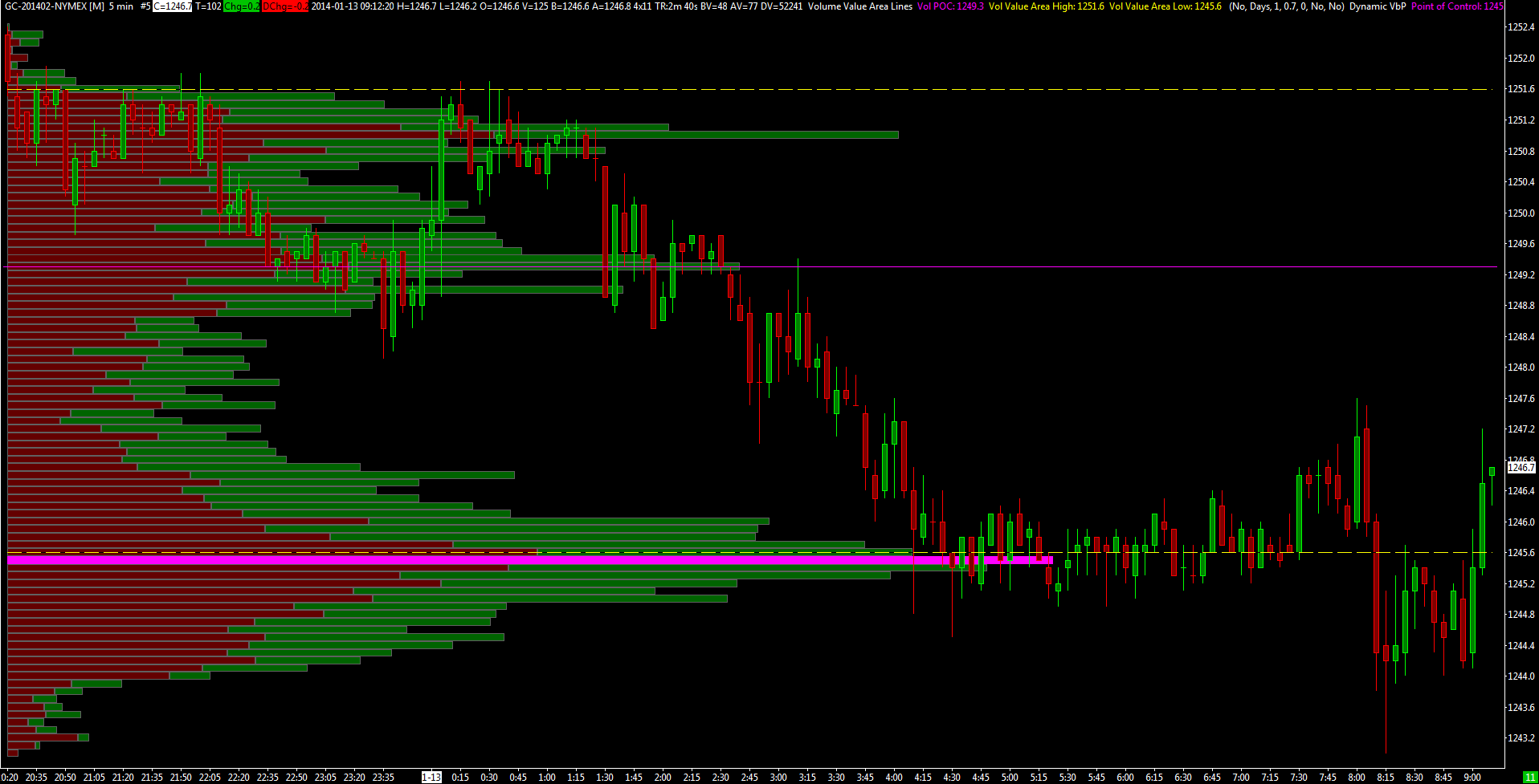 I use Sierra Chart default settings for intra-day charts for both studies. They should be the same. I tested the five-minute chart of ES, NG, NQ, CL, GC and ZS in the morning. Only GC and ZS had this problem. By 12:28 PM Eastern Time, the ZS VPOC of both studies matched, but the GC VPOC were still different. Globex session has begun. I did a quick check: the gold VPOC of both studies ( the two pink lines ) did agree. I also compared notes with one of my friends, who has been using Optimus Futures Rithmic Feed. It seems that the VPOC from Volume by Price is the correct one. Are there any other settings that I need to pay attention to ? Date Time Of Last Edit: 2014-01-14 00:12:02