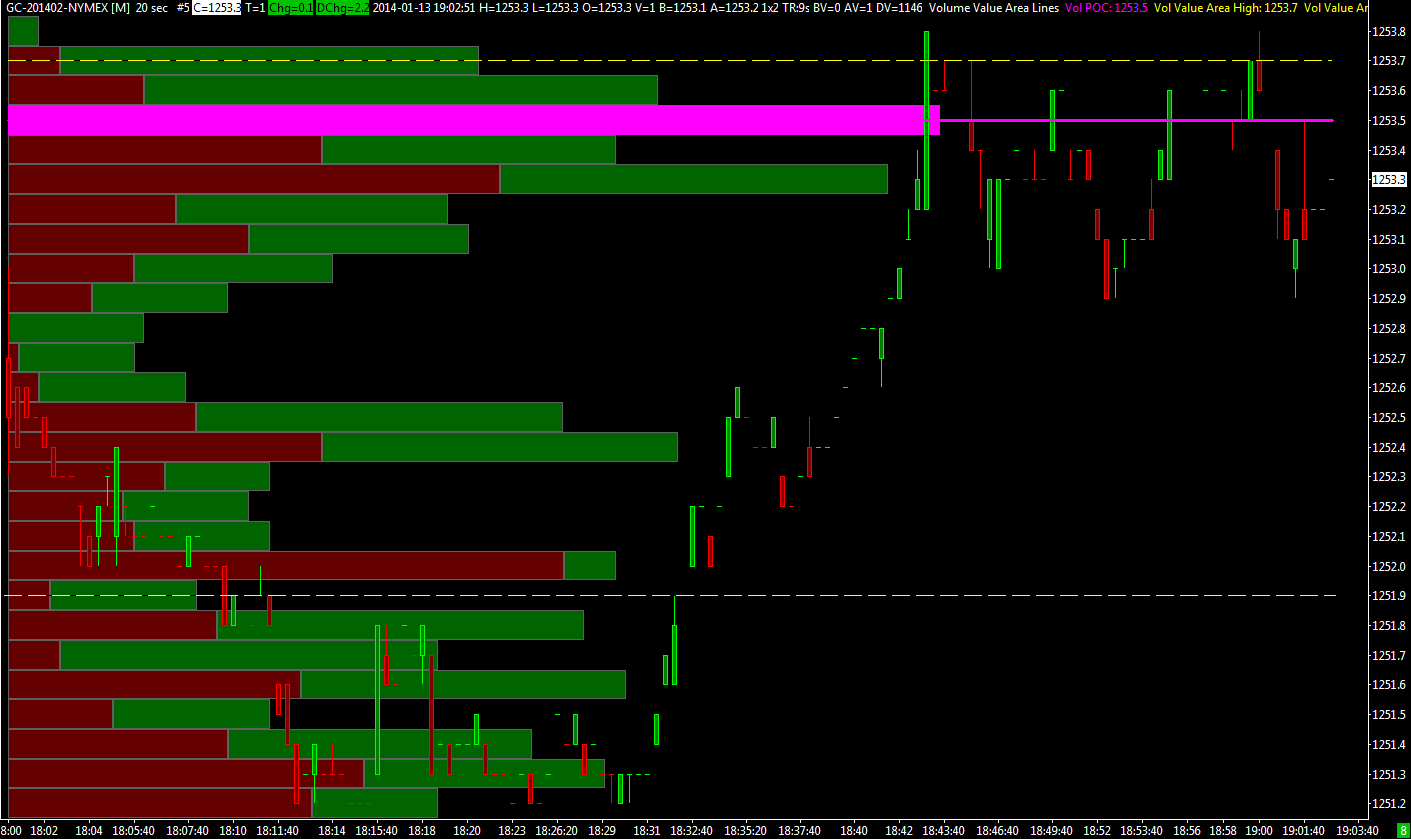 Hi, I am comparing the volume point of control ( VPOC ) from the two studies "Volume by Price" and "Volume Value Area Lines". For oil futures, they agreed perfectly. I then selected "chart setting", and changed the symbol from CL-201402-NYMEX to GC-201402-NYMEX. The gold VPOC ( pink lines ) were different. Should the VPOC from the two studies be always the same ? Thanks. Date Time Of Last Edit: 2014-01-13 15:24:18