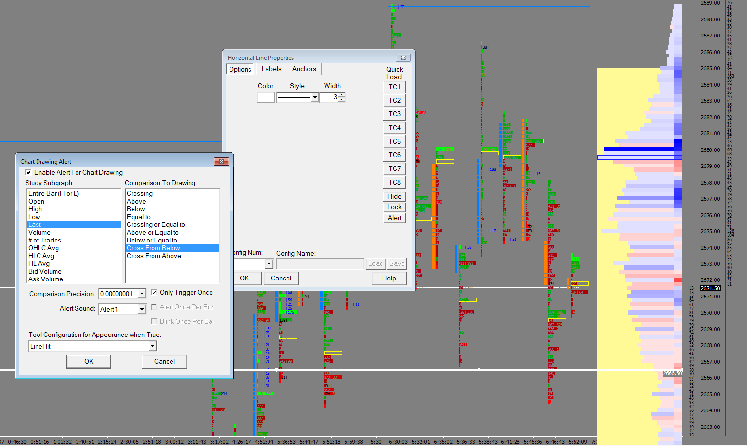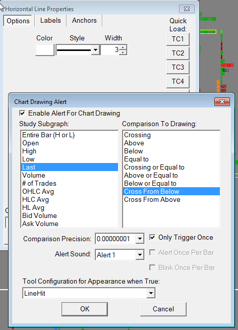 Hello. I have a 30T Reversal Chart. When price was trading at 2670 I placed a horizontal line at 2666.50. This had a alert attached to it with a LAST Crossing from Below on it. So I expected that when price would go BELOW 2666.50, then cross back ABOVE 2666.50 I would get a alert. But as you can see that didn't happen. Please let me know how I can fix this? When the alert is generated, it changes to a black line using the a "Line Hit" config. |