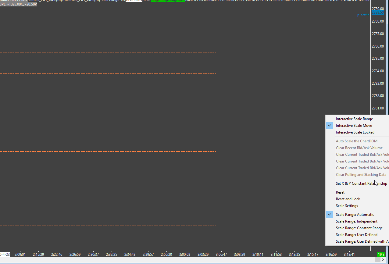 We are not sure exactly what you are looking for, but the most likely thing is make sure you enable the following setting: General Settings Window: Allow New Data In Unlocked Fill Space (Global Settings >> General Settings >> Charts >> Charts) The other thing that is possible is that you have the Fill Space locked. Refer to this setting: Chart Settings: Lock Fill Space (Chart >> Chart Settings >> Display >> Chart Display Items menu) Sierra Chart Support - Engineering Level Your definitive source for support. Other responses are from users. Try to keep your questions brief and to the point. Be aware of support policy: https://www.sierrachart.com/index.php?l=PostingInformation.php#GeneralInformation For the most reliable, advanced, and zero cost futures order routing, *change* to the Teton service: Sierra Chart Teton Futures Order Routing |