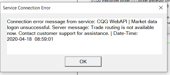 Hi I got a message to contact Support when trying to connect to CQG WebAPI . "Trade routing is not available now". Is there anything that can be done or I just need to wait? thank you. |
