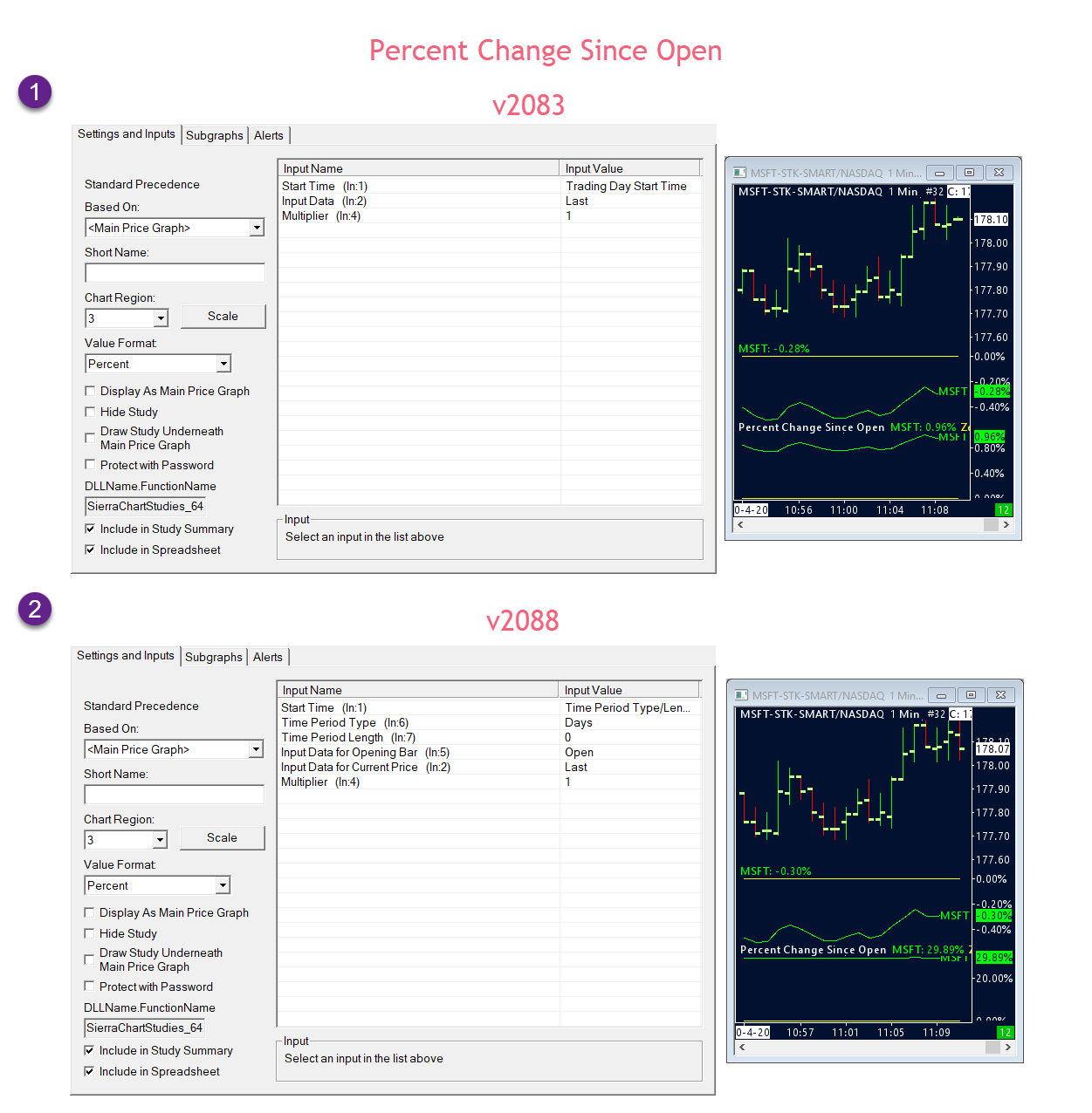 The Percent Change Since Open study changed in 2088, adding several new inputs. Without making any changes to the inputs, upgrading from v2083, the results achieved on v2088 appear incorrect. I have attached an image of the settings and charts showing the discrepancy. Date Time Of Last Edit: 2020-04-20 15:35:41