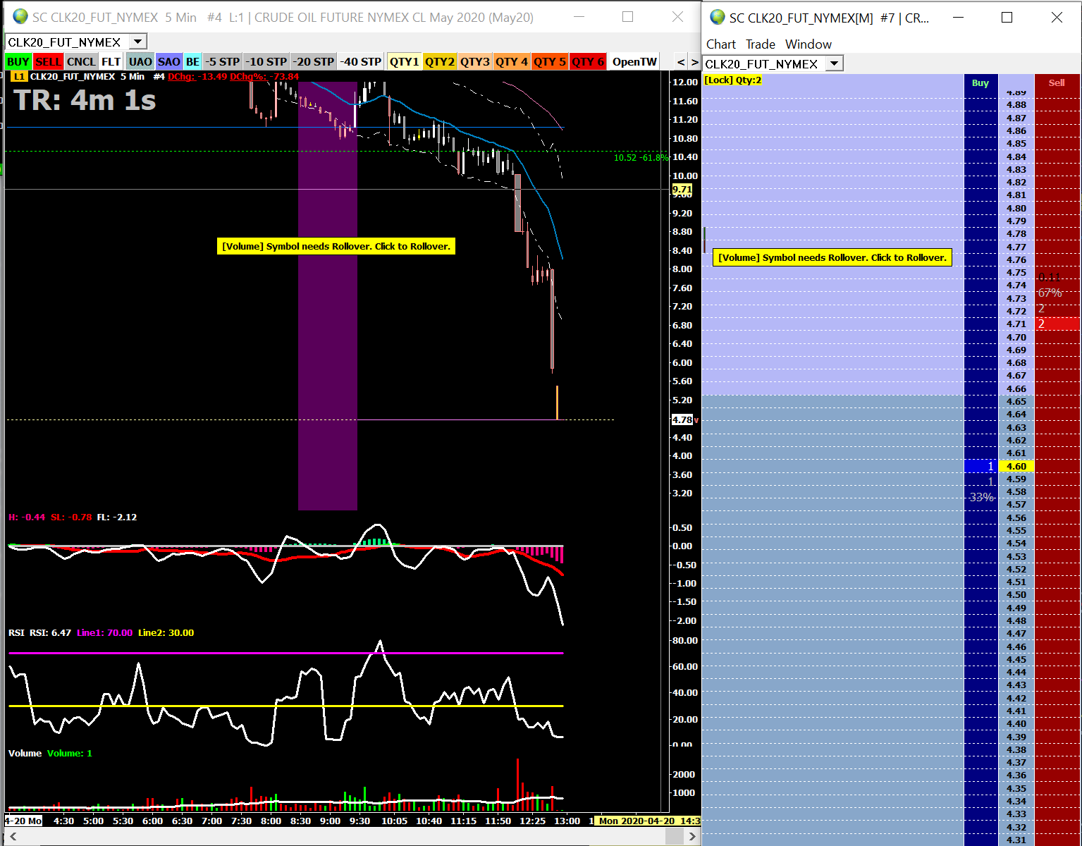 1. After disabling error filtering, my CQG chart in a separate SC install is still showing a price gap between $0 and -$36 in CL May. Delete and download doesn't fix it. 2. The spread symbol showing issues is CL:C1 RB-CL M20.CL.FUT_SPREAD.NYMEX, first attached. 3. Also seeing incorrect data on CL Monthly older Historical, second attached. A delete and download corrects this, but it returns like this incorrect on subsequent startups again. Never seen these before disabling the error filtering. Edit: This is happening on other symbols also on historical charts, NG Monthly, etc. 4. What could be the cause of the severe lag/lack of updates on chart vs DOM, keeping in mind only the Denali feed chart lagged, the same chart on CQG did not at that time. Third attached. The Quoteboard also seemed more timely than the chart during this. Note, it is not a studies/update interval/load type issue, the chart has never lagged before this instance yesterday and is simple. Date Time Of Last Edit: 2020-04-23 20:36:10