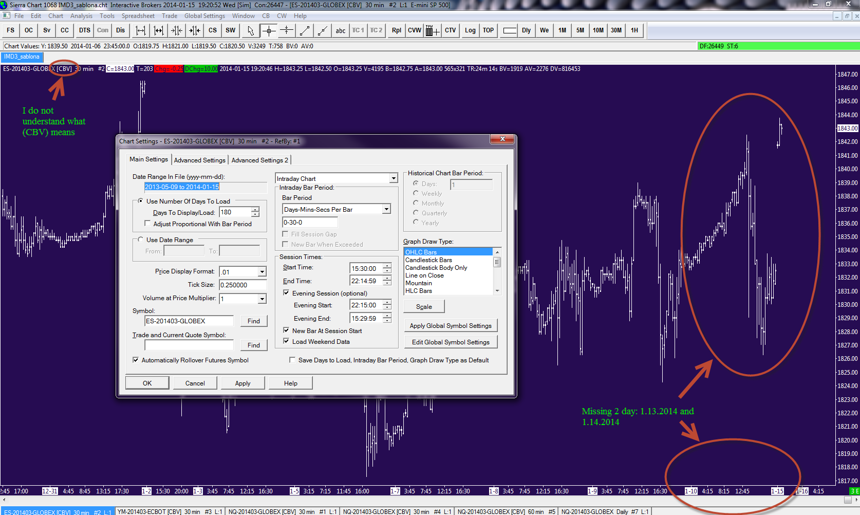 1. The first step is to update Sierra Chart to version 1077 or higher. See 2 below for help with this. 1.1. To fill in the missing data in your chart, refer to help topic 7.1 here: http://www.sierrachart.com/index.php?l=doc/helpdetails7.html#RefreshWithData 1.2. Set Chart >> Chart Settings >> Advanced Settings >>Continuous Futures Contract - Date Rule Rollover, Back Adjusted. 2. The problem with updating Sierra Chart is because you still have Sierra Chart running. You need to exit from Sierra Chart during the installation process. This will solve the problem. It does look as though you are exiting from Sierra Chart, but for some reason that is taking longer than expected. You need to wait for that process to complete 3. For a description of the Continuous Contract indicators you see on the chart (CBV), refer to the bottom of this page: https://www.sierrachart.com/index.php?l=doc/doc_ContinuousFuturesContractCharts.html#RolloverOptions Sierra Chart Support - Engineering Level Your definitive source for support. Other responses are from users. Try to keep your questions brief and to the point. Be aware of support policy: https://www.sierrachart.com/index.php?l=PostingInformation.php#GeneralInformation For the most reliable, advanced, and zero cost futures order routing, *change* to the Teton service: Sierra Chart Teton Futures Order Routing |