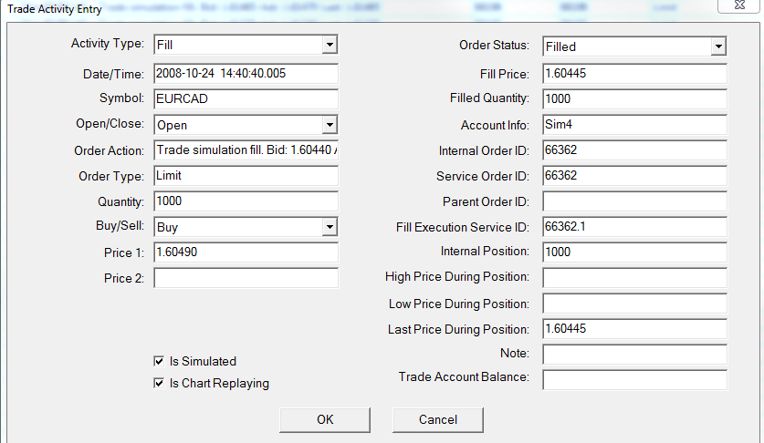 Please allow me to be clear: I use either a stop-limit or limit to enter the market not a stop(market) order. The trade window is set for limit, but a stop order is being placed instead. Is there any way to know the FXCM spread during replay? I am currently trying to check if the price is being adjusted to incorporate the spread costs. eg ActivityType DateTime Symbol OrderActionSource InternalOrderID ServiceOrderID OrderType Quantity BuySell Price Price2 OrderStatus FillPrice FilledQuantity TradeAccount OpenClose ParentInternalOrderID PositionQuantity FillExecutionServiceID HighDuringPosition LowDuringPosition Note AccountBalance Fill 2008-10-13 10:10:45.001 [Sim]EURCAD Trade simulation fill. Bid: 1.58900 Ask: 1.58905 Last: 1.58905 64933 64933 Stop 1000 Buy 1.58870 Filled 1.58905 1000 Sim4 Open 1000 64933.1 Fill 2008-10-13 10:18:12.001 [Sim]EURCAD Trade simulation fill. Bid: 1.59120 Ask: 1.59125 Last: 1.59125 64934 64934 Limit 1000 Sell 1.59105 Filled 1.59120 1000 Sim4 Close 64933 64934.1 1.59126 1.58858 Date Time Of Last Edit: 2020-04-29 15:06:29