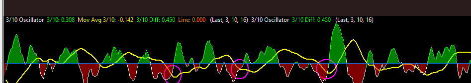 How can I color bars when the 3/10 oscillator - 3/10 Diff(SG3) crosses over the Mov Avg 3/10 (SG2). See the circled areas in the 3/10 oscillator on the attached this is where I would like the bars to be colored when the red filled area crosses above the yellow line. thanks, bob http://www.sierrachart.com/image.php?Image=1587930839732.png |