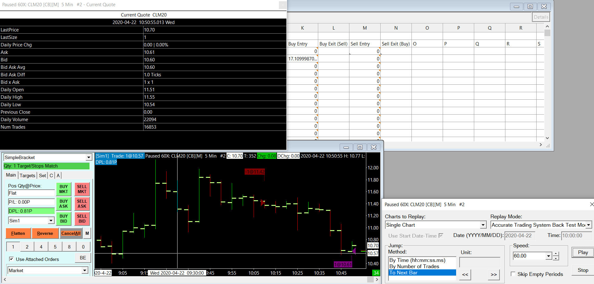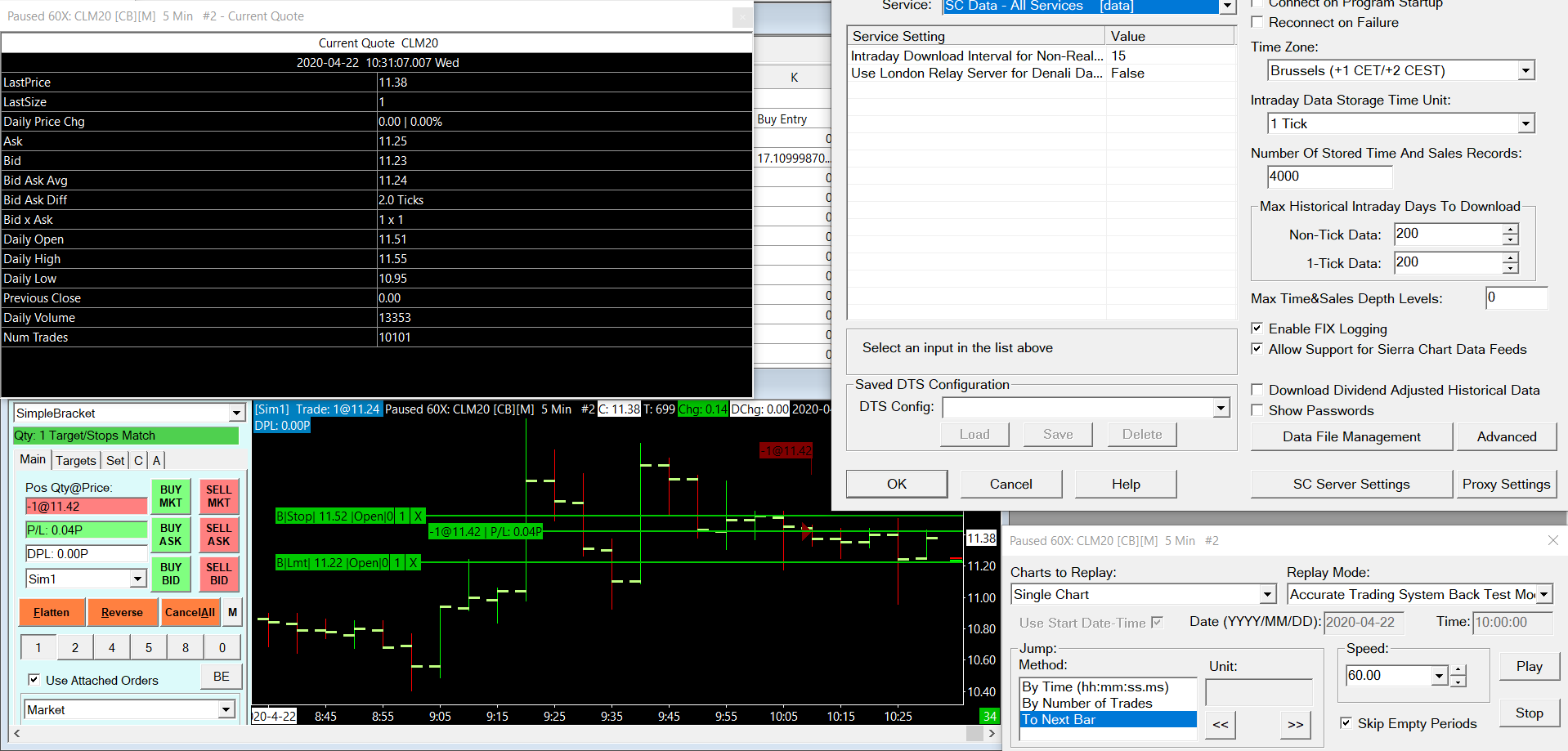 Hello Sierra-Team, I have created a small automated trading program via spreadsheets. But a backtesting in replay mode gives completely wrong results, because bid and ask are not updated (sometime it takes 3-4 candles). I have read the hint that tick-data are needed here: Auto Trade System Back Testing: Using Actual Bid and Ask Prices During Back Test But no matter what I set, I get a completely wrong result (40 ticks difference!!). What is wrong here ? Or is there a setting where simply the "current price" is used when touching the LMT order ? Without an approximation any function concerning automated trading is useless if it cannot be tested properly (without running 2 months sim mode in realtime). Used Sierra-Chart Version: 2088 / package 5 Many thanks for the help. |