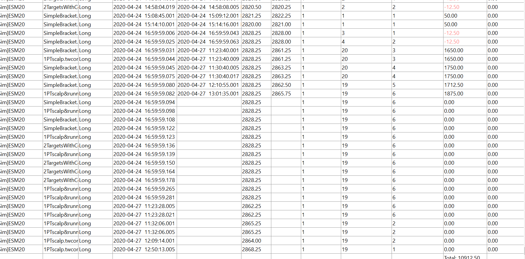 Hi, I'm not getting any simulated profit/loss data from my recent sim trades (all the ones from today, 4/27). I was getting them previously when I was randomly putting in orders just to test out the automated strategies as I was setting them up. As we can see there is no "Exit" time. Not sure what is going on. Also, in the same picture we can see some orders that entered 4/24 and exited 4/27. I do not understand that as those test "orders" were almost immediately cancelled after being placed. I continue to have a working orders overlay box on my chart, so I believe my orders are not being cancelled? Thanks for the help |