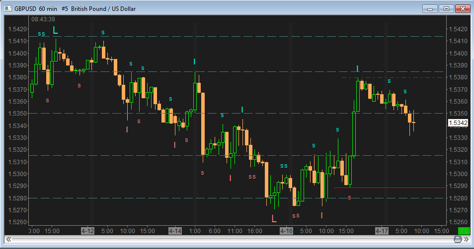Would that mean I get the keys to the forum... It needs a bit of tidying up (which I'll do today, adding comments) I'm not sure the code is the most efficient and it's not perfect but it works for what I need. I've attached a picture of the the Study using the Hourly chart GBPUSD pair from the London Open this morning. The most recent 'I' would eventually update to a 'L' if a a lower 'I' is formed subsequently but basically a Short Term High is using the code for a Swing High. An Intermediate High having lower Short Term Highs either side of it and a Long Term High having lower Intermediate Highs either side of it. Obviously opposite for Lows. edit: The 'Offset' study setting is needed for the chart so the MS characters are not too far away or to close to the candles. Date Time Of Last Edit: 2013-04-17 08:03:23