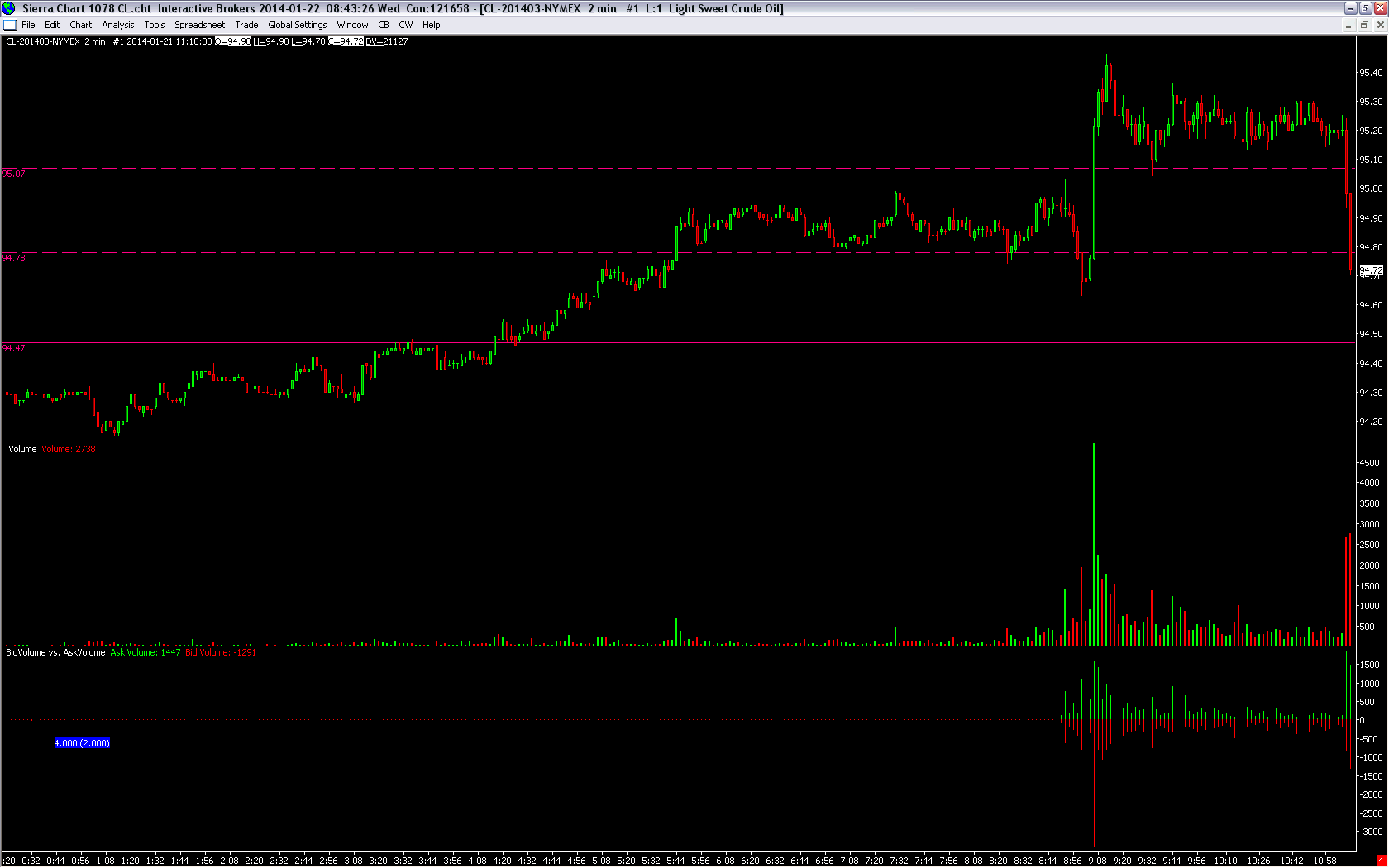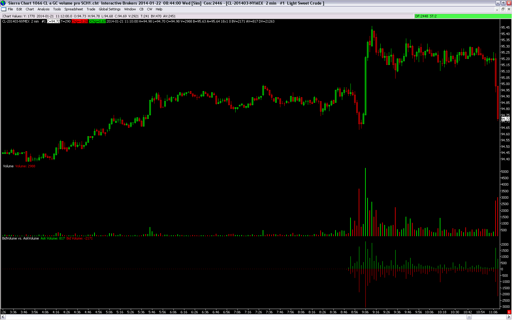 thanks to everyone for explanation. i did not know that. i thought if the volume 2738 is correct and i make bid vol 1447 +ask vol 1291 which is 2738 and this is correct, so i just thought bid vol and ask vol is also correct. i did not think this about regular datafeed from IB (not TRUE REAL-TIMEDATA IN INTRADAY CHARTS) i thought this just about TRUE REAL-TIMEDATA IN INTRADAY CHARTS. so, once again - thanks for this explanation. anyway, once again this my question: if this case is on (i have no tick data but when i will see it i will check if this is going to happened. if somebody has tick data, pls check this case. if yes > then > how can be possible the GROWING (long) bar has been traded for DECREASING (selling) bid price? Date Time Of Last Edit: 2014-01-23 08:46:45
