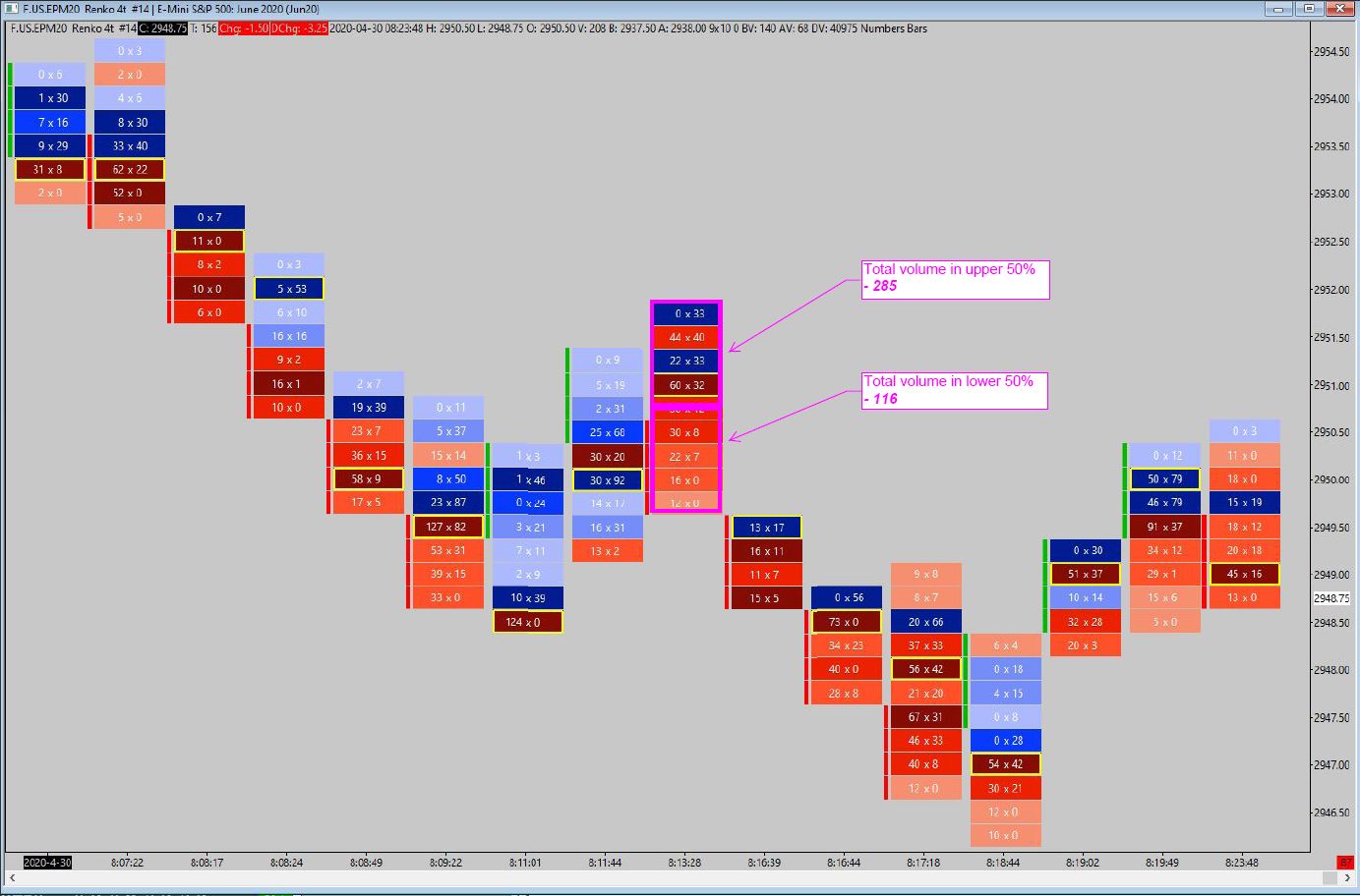 I am utilising the Spreadsheet Study to develop signals for conditions met within my manual trading strategy. Can anyone tell me if there is a way to determine the total/percentage volume within each bar at specific price points or halves/quartiles within the bar range? I have included a screenshot to illustrate. Being able to use the volume split into either upper/lower half of the bar or quartiles would be a great analysis tool. In the attached example the volume at the central price point would be split between the upper and lower. Alternate to total volume, percentages in each half/quartile would also work well. Many thanks... |