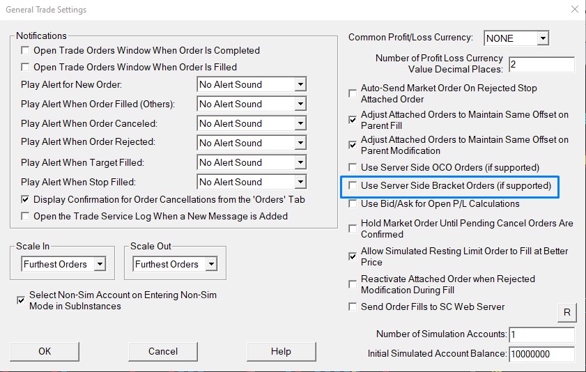 Sorry, can you please clarify response #1: 1.1. Do I disable or enable "Use Server Side OCO Orders"? 1.2. Do I disable or enable "Use Server side Bracket Orders"? 1.3. If I disable "Use Server side Bracket Orders", can I still use "Use Attached Orders" with a stop loss and target? |