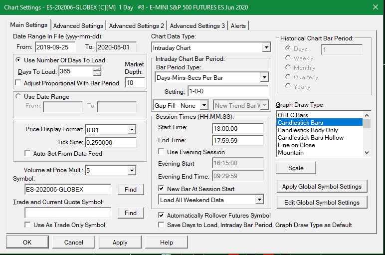 When using Daily Historical Chart, each bar's date labels on the bottom of the chart are showing as desired: Mon, Tues, Wed, Thur, Fri But using 1 day Intraday Chart and reverse session time of 18:00 - 17:59, the bar's date labels are showing as Sun, Mon, Tues, Wed, Thur, which is a little confusing because the Thur label is actually the end of Friday's session (and there is no Fri label, it starts next week on Sun). Is it possible to configure the Intraday Chart 1 day to display the labels like the Historical Chart? I want to capture the entire Globex Session from start to finish but have the date labels reflect when the session ends instead of when it starts. I've attached a few screenshots of my configuration. http://www.sierrachart.com/image.php?Image=1588450118438.png http://www.sierrachart.com/image.php?Image=1588450171812.png |