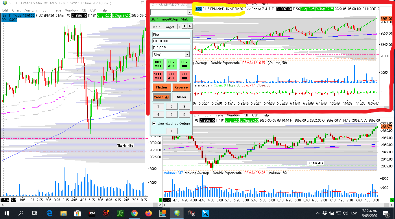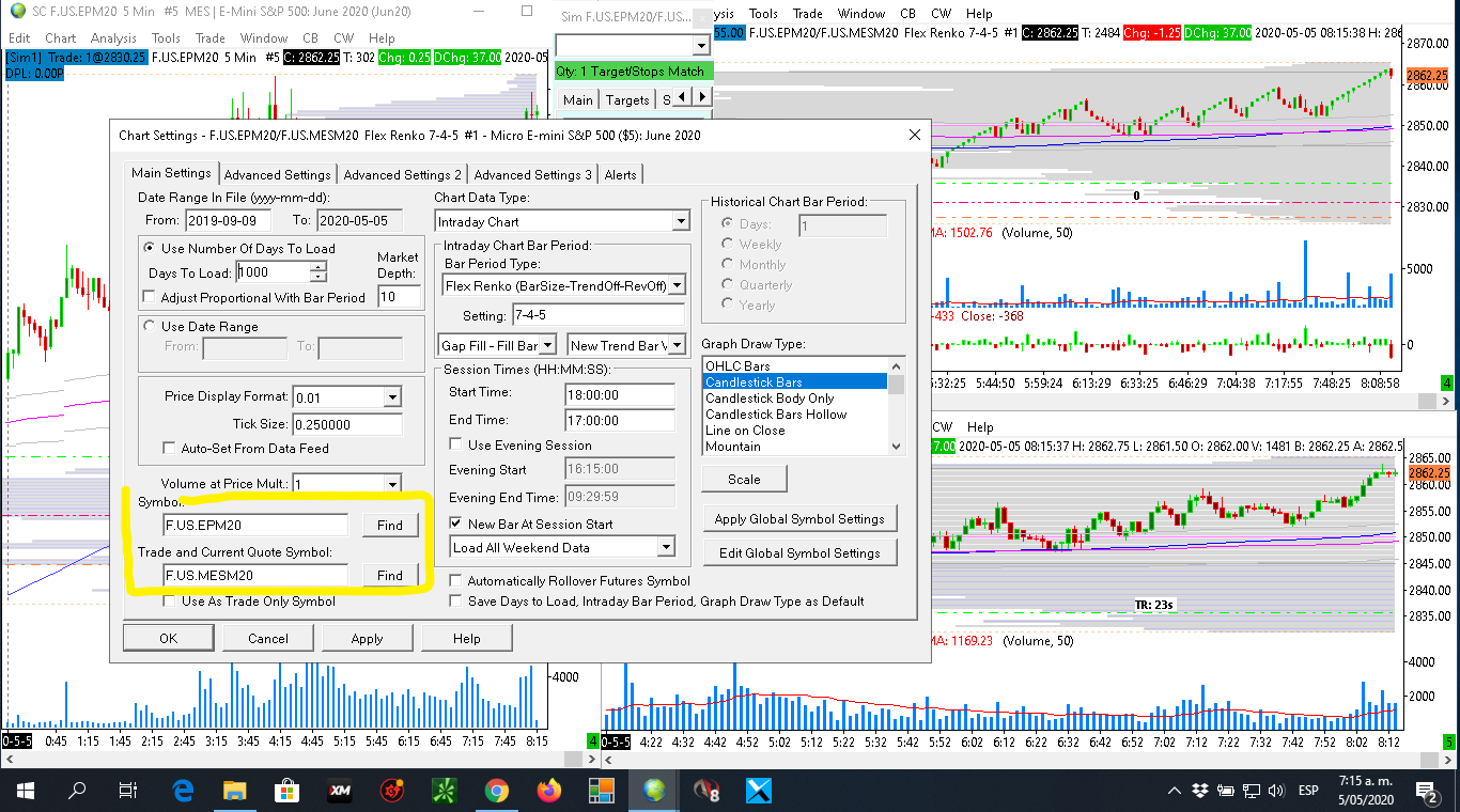 Buenos dias, Al dia de hoy tengo configurado mi grafico para que me muestre el movimiento del precio para el instrumento ES y para que el trade se ejecute en con el micro (MES), sin embargo, no sucede asi ya que la operacion esta siendo tomada en el ES. ¿Que podria estar pasando? ¿como soluciono? Agrdezco la ayuda prestada a la prsente solicitud. Juan Date Time Of Last Edit: 2020-05-08 07:02:49