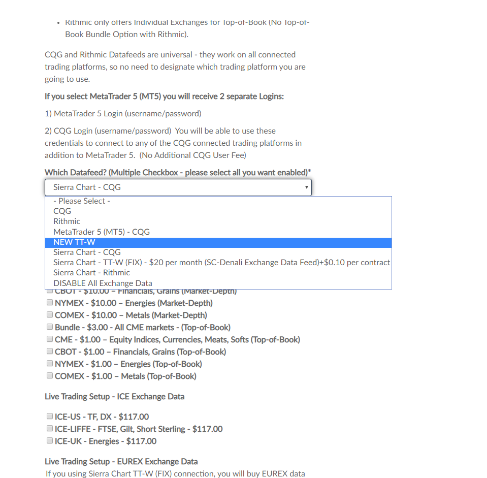 Yes for EUREX you would need to use the Sierra Chart Exchange Data Feed: Sierra Chart Exchange Data Feed 2. Should I pay the datafeed (25 USD for 20 symbols) and the exchange fees (21 USD for EUREX non pro) through Sierra Chart ? And in this case if you want to trade on EUREX you can use the Sierra Chart Order Routing Service as well: Sierra Chart / Trading Technologies Futures Order Routing Service You can also use CQG for EUREX data and trading: CQG Trading Platform Service Sierra Chart Support - Engineering Level Your definitive source for support. Other responses are from users. Try to keep your questions brief and to the point. Be aware of support policy: https://www.sierrachart.com/index.php?l=PostingInformation.php#GeneralInformation For the most reliable, advanced, and zero cost futures order routing, *change* to the Teton service: Sierra Chart Teton Futures Order Routing Date Time Of Last Edit: 2020-05-11 20:23:57