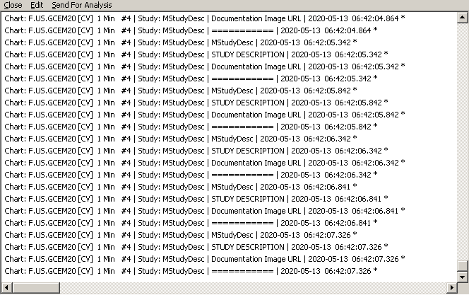 There is not any problem. This is what we see in the Message Log: Chart: ESM20[M] Daily #1 | Study: MStudyDesc | =========== | 2020-05-12 17:05:19.232 *