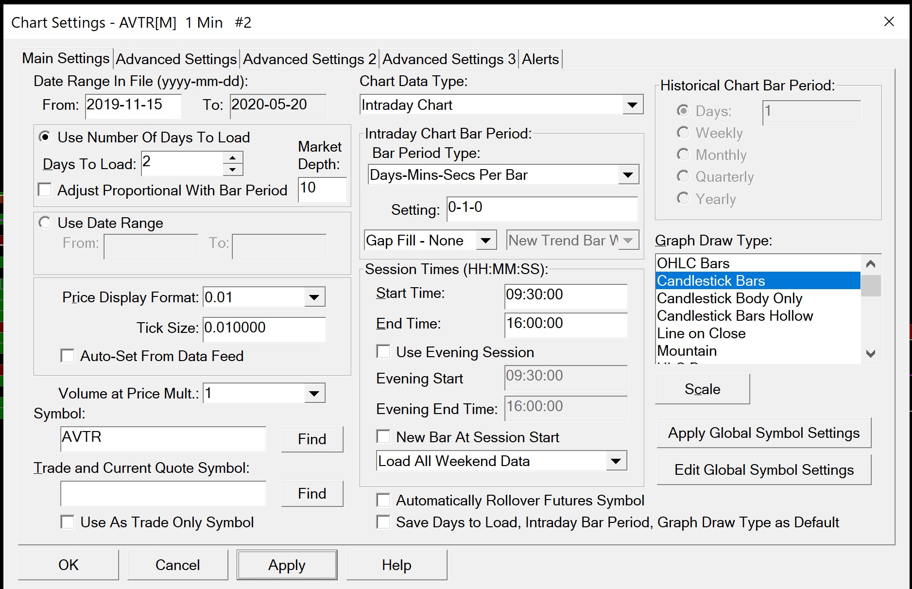 I've read the directions but still can not figure out why there is a problem. When I open Sierra Charts for the first time, the cart will have a time displaying 09:30:00-16:00:00 but as soon as a change the symbol then the starting time on the chart still shows 13:00:00. I've attached a picture of my settings. |