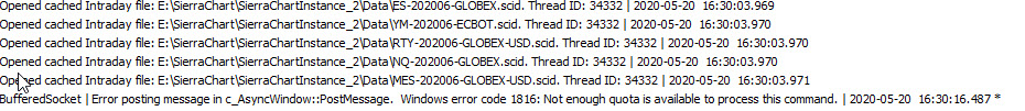 That Windows error code 1816 is extremely unusual. The first thing to look at is the chart update interval: High CPU Usage | Inactive User Interface | Poor Performance | Long Time to Load Chart Data | Charts Reloading Often: 30.5 - Chart Update Interval What studies are you using on the charts? And then refer to this section: High CPU Usage | Inactive User Interface | Poor Performance | Long Time to Load Chart Data | Charts Reloading Often: 30.48 - Basic Steps to Resolve Performance Issue in Sierra Chart Sierra Chart Support - Engineering Level Your definitive source for support. Other responses are from users. Try to keep your questions brief and to the point. Be aware of support policy: https://www.sierrachart.com/index.php?l=PostingInformation.php#GeneralInformation For the most reliable, advanced, and zero cost futures order routing, *change* to the Teton service: Sierra Chart Teton Futures Order Routing |