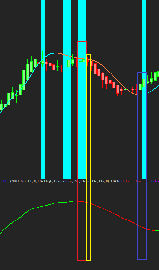 Thank you for the reply Ackin, I've used those that you suggested but they only signify changes in slope, not the actual continuing state of slope (either positive or negative). I tried your slope signal alert (based on study) which signifies changes from +/- like those suggested and it does a superb job, but only for one bar. I need it to repeat that alert until it changes states again. Any ideas of how that could be accomplished? Also, in your slope signal alert study, the alerts are always a bar behind the change in slope, but if I use the formula examples in SC, they alert on the bar OF the change. Any suggestions would be greatly appreciated. In the first example, I dont want it to initiate trades on bars outlined in red where I have a 2/3 long signal but cant confirm because there is no alert present for the slope so it wants to initate a long trade there, but the next bar outlined in yellow, it should initiate a short on that bar. And again in the bars outlined in blue, it's trying again initiate a long position and it should not be because I have a neg slope, but no ability to alert that. In the second example pic, its just showing the alerts being 1 bar behind on the slope change. |