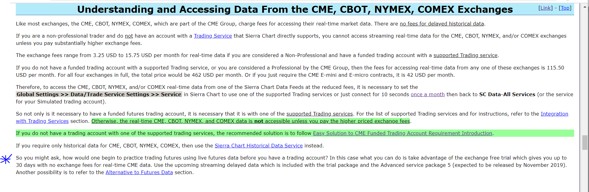 The CME Group does not distinguish between Sim accounts and live accounts. Since you are getting your data from Rithmic, you would need to ask Rithmic about why you are not getting the full depth. You also have the option of using the Denali Exchange Data Feed for your data, which also has the option of the Market Depth data. Just be aware that the CME Group requires that you have a live and funded trading account that can be verified, in order to qualify for the lower-priced non-professional exchange fees. This does not include a Earn 2 Trade account. Refer to the information here: Real-Time Exchange Data Feeds Available From Sierra Chart: Understanding and Accessing Data From the CME, CBOT, NYMEX, COMEX Exchanges And yes, the first time you use a CME Group exchange, it is free for the remainder of the month in which it is activated. Sierra Chart Support - Engineering Level Your definitive source for support. Other responses are from users. Try to keep your questions brief and to the point. Be aware of support policy: https://www.sierrachart.com/index.php?l=PostingInformation.php#GeneralInformation For the most reliable, advanced, and zero cost futures order routing, *change* to the Teton service: Sierra Chart Teton Futures Order Routing |