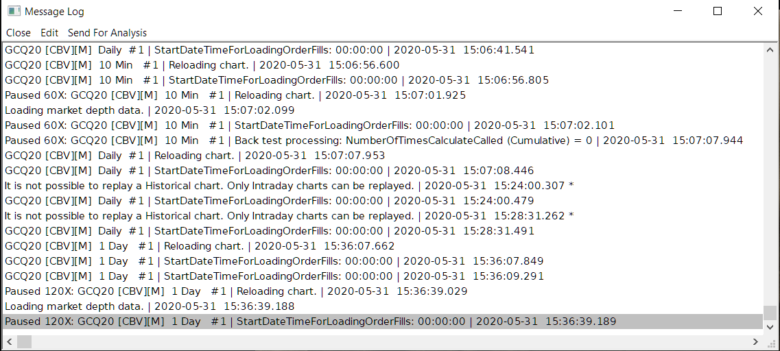 Hi, When trading I am looking at real time data on daily chart. I am using indicators that change according to daily data. To test my strategies I want to replicate the same in replaying the chart, namely I want to set chart period to daily and "play" the chart. So far I am able to replay the chart only when the period is 30min or so Please see attached my Message Log. Please advise. Date Time Of Last Edit: 2020-05-31 15:38:44