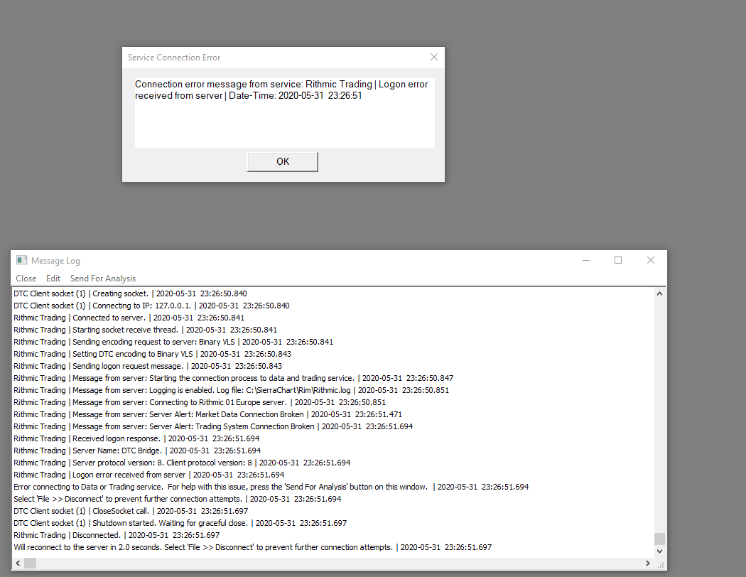 Hi Both my Sierra charts & Jigsaw DOM were working ok until Friday using my Rithmic datafeed. Today I can only connect to Rithmic data feed on my Jigsaw DOM but not Sierra charts. I talked to my broker Amp, I have 2 datafeeds still enabled with Rithmic & they got me to test connect to Rtrader which was successful. Attached are the error logs from Sierra. Can you please help as I cannot trade without my charts. |