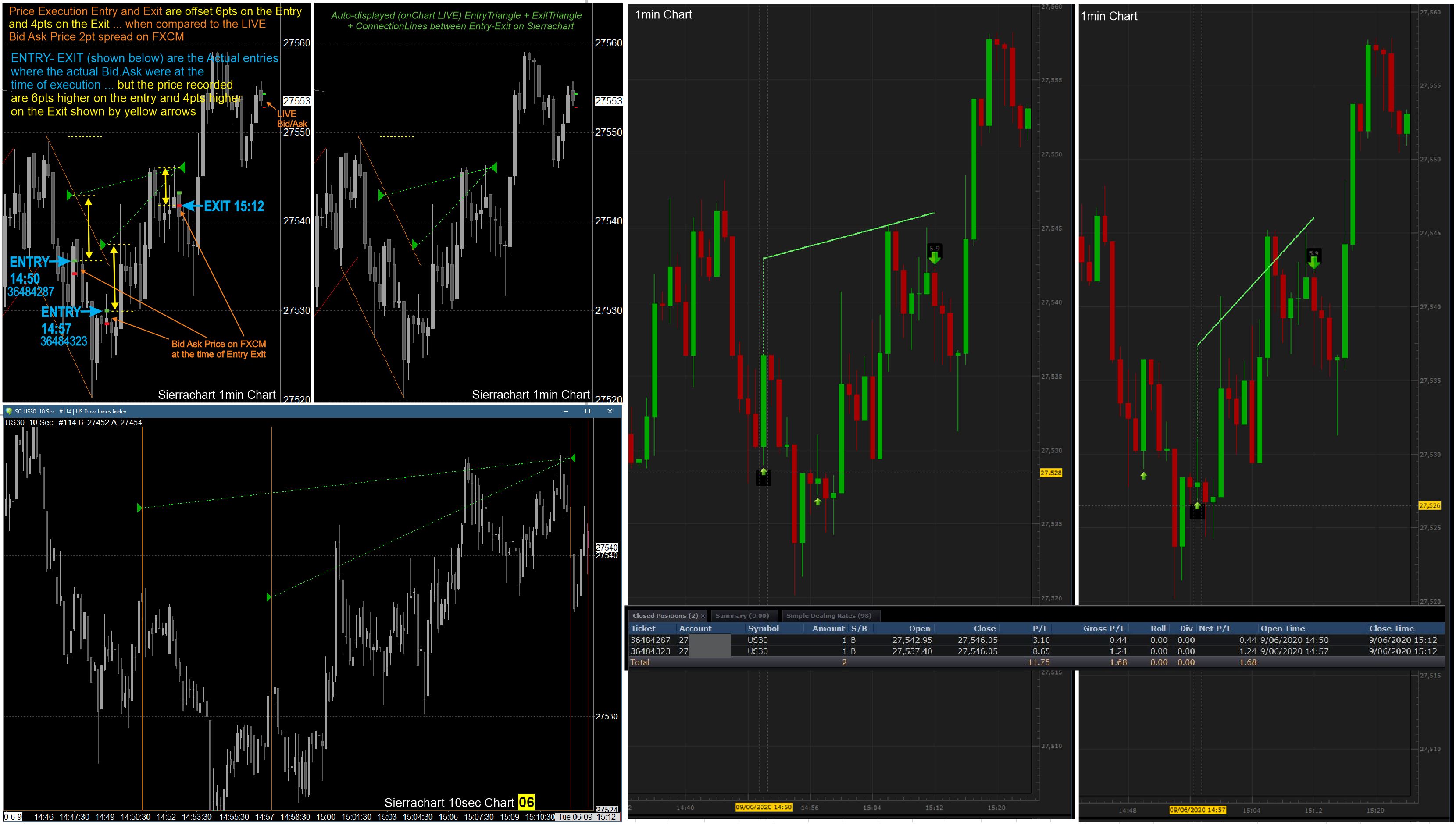 This still begs the question: why are the Entry Exit prices on the chart not aligned? The only explanations would be that the market data is delayed which should not be to our knowledge, or that or the fill prices from FXCM are very different than the market prices for reasons unknown. You really should switch to trading micro YM futures on the CME. That is a safe liquid environment. Sierra Chart Support - Engineering Level Your definitive source for support. Other responses are from users. Try to keep your questions brief and to the point. Be aware of support policy: https://www.sierrachart.com/index.php?l=PostingInformation.php#GeneralInformation For the most reliable, advanced, and zero cost futures order routing, *change* to the Teton service: Sierra Chart Teton Futures Order Routing Date Time Of Last Edit: 2020-06-11 01:45:15