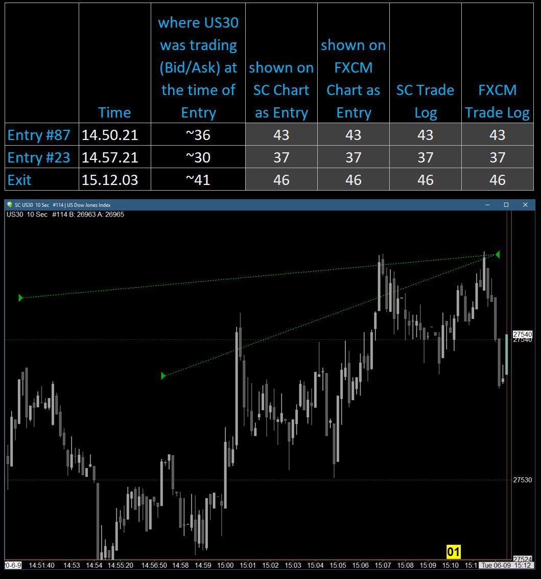 All fills are inline with SC+FXCM charts and trade log ... see attached. This still begs the question: why are the Entry Exit prices on the chart not aligned? Slippage is also ruled out, as both, Entry + Exit price are higher then where the market was trading at that moment in time on the chart, (see pic). Also ... Upon checking all past trades displayed on SC 1min chart, this offset problem started as of (incl) Monday May25,2020; all trades prior, still do (did) display correct, but as of May25 including nine trades yesterday are all offset. iow. if the US30 is at Ask.27232/Bid.27230 and EnterLong, fill price is displayed (on chart) and recorded as 27238, even though US30 has not even traded anywhere near 27238 (on the chart. AND, if at Exit the price is at Ask.27246/Bid.27244, fill price is then displayed (on chart) and recorded at 27248; like I said, something is not aligned. ps. FXCM support is getting worse today than it was even years ago ... so, I stated talking with Lmax ................ ur off-record comment? |