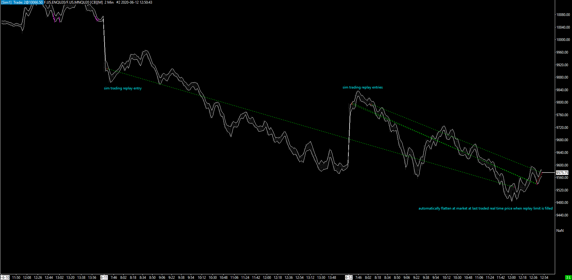 I have this exact same problem. Was going to post a new thread but I know how to use the search function and found this. Steps to recreate the problem: 1. Put chart in replay mode. 2. Put in a limit order. example Short 2 contracts. 3. As soon as the price in REPLAY mode hits the limit order and fills, it immediately flattens the trade at the last price of the LIVE market data (waaay off the chart to the right in the future) 4. Stop the replay. 5. When the chart reloads, you are now short 2 contracts at the market at the last price of live data. This started out of nowhere. I was using replay just fine last weekend. -Updated to latest version. Did not fix. -Disconnected from data feed. Did not fix. -Cleared all sim data. Did not fix. -Tried multiple different days, didn't make a difference. Trade activity log attached. Screenshot: http://www.sierrachart.com/image.php?Image=159199024089.png In this screenshot, I am playing a replay of the open of 6/11 and the open of 6/12. The actual real time is between 12:00 pm and 13:00 pm on 6/12 and every replay sim entry I take automatically fills at whatever the last price was at that time. |