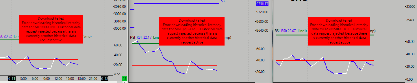 Hello, In the morning, I get my Market data in real time. But, at 3:30 p.m. in the open US markets, I am not receiving the Market stream from Rithmic in real time. My graphics very often late. I noticed that the opening of the next candle is not done with the clock (timing) on the software screen, but is delayed from 2 to 35 seconds. Often the delay (opening of the next 2min candle) is so huge 20 to 35s that I am forced to click on the DISCONNECT button and then click on CONNECT to force SIERRA CHART to update my graph. I tried the old versions of SIERRA CHART. But it's always the same. I thought it was an internet connection problem. To do this, I switched from a 4G mobile internet service provider 10Mbps to another internet service fiber optics provider using 30 Mbps. But the problem persists. Since last week, I only use a chartbook including 3 charts (MESM0-MNQM0 and MYMM0) on a time unit of 1H and only one DOM. I also encounter daily difficulties updating my charts. When updating my different this error message is displayed: « Download failed. Error downloading historical intraday data for NQM0-CME. Historical data request rejected because there is currently another historical data request active. » I don't know what other active historical data request SIERRA CHART is talking about to the point of rejecting all of my update requests each time. Due to this delay, I cannot take a position from OPEN US. I cannot work properly and take advantage of the great opportunities that the market offers to traders. Please help me resolve this issue which is preventing my charts from being updated. Can you help me receive my rithmic data in real time when open to US markets. How to remedy this situation? Date Time Of Last Edit: 2020-06-11 16:47:10