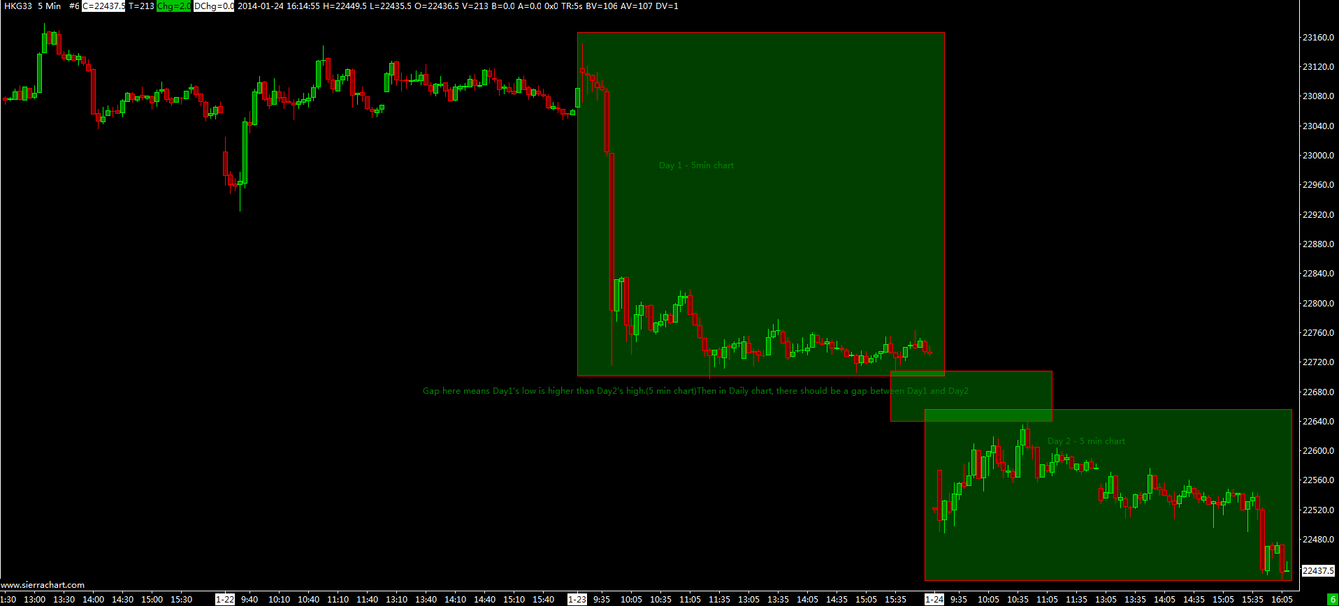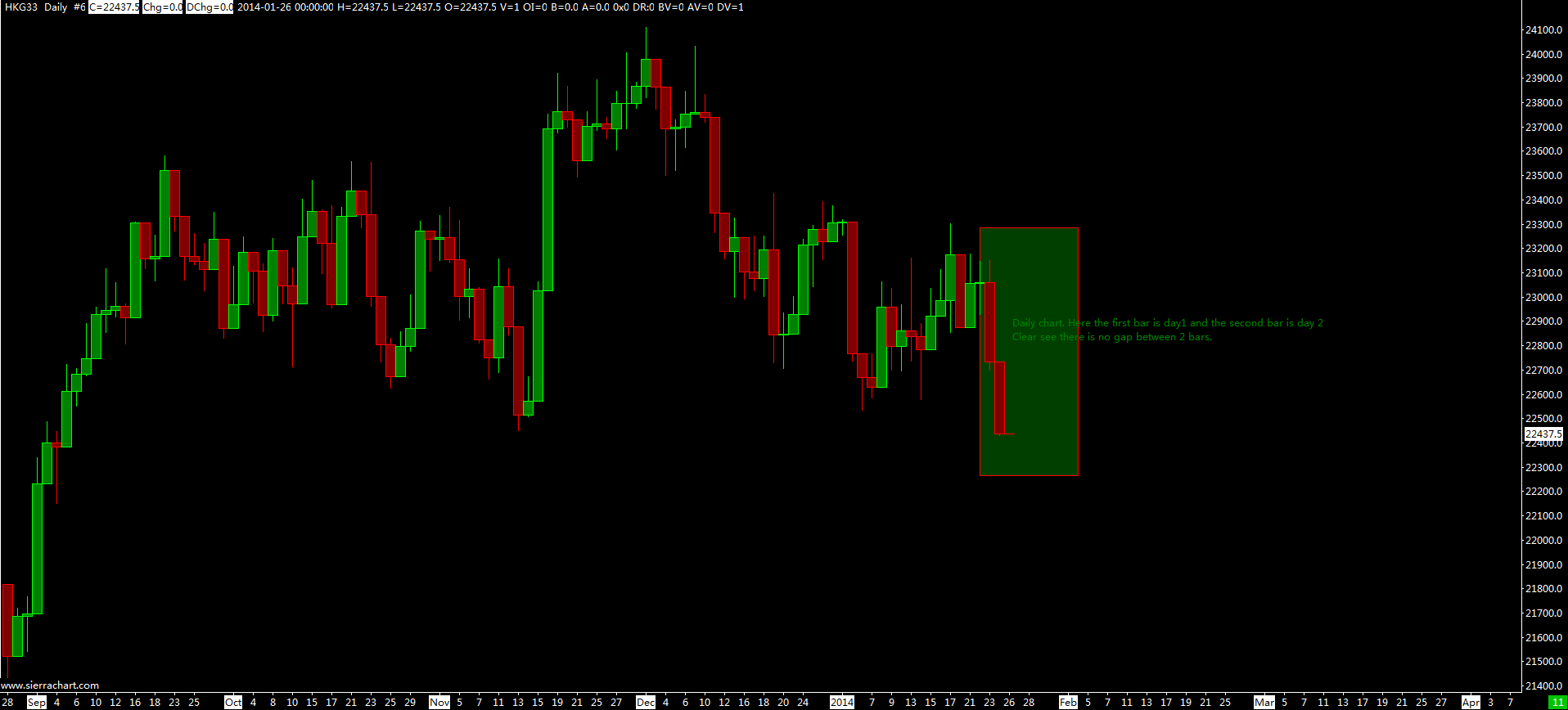Here is the 5-min chart page.You could clear see there is gap between day1 and day2. So in daily chart,it should have been clear gap between 2 days. http://www.sierrachart.com/image.php?l=1390741406574.png Here is the daily chart page.First bar is Day1 and the second bar is Day2. http://www.sierrachart.com/image.php?l=1390741588723.png So may I wonder is there any setting in daily chart that request to fill the gap between 2 bars? I may choose it by mistake. Thanks! |